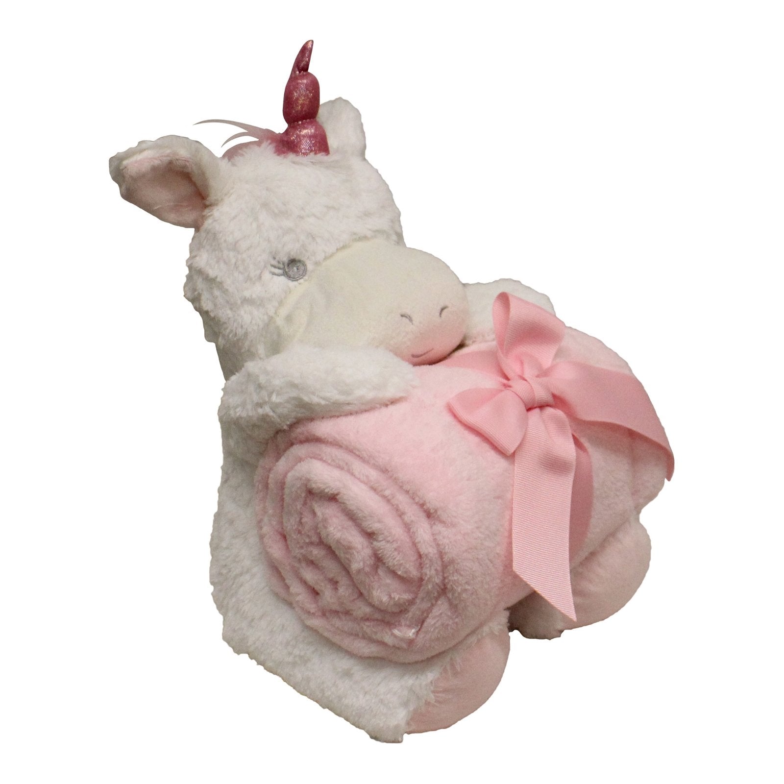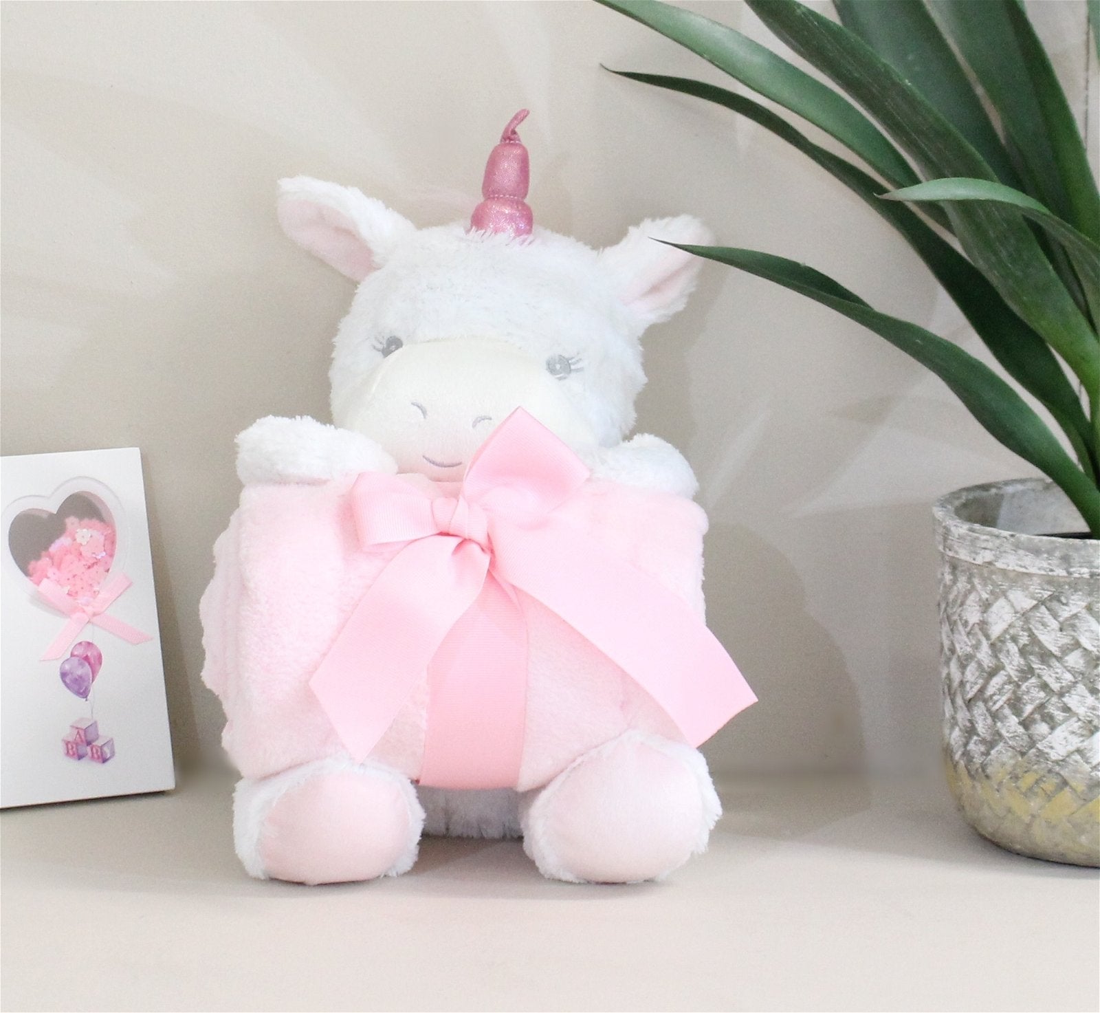 Beautiful new baby gift featuring a unicorn teddy holding a pink fleece throw. Made of 100% Polyester. Size of teddy W19 D20 H32cm. Size of throw 100x70cm. Measurements: D20 x H32 x W19cm