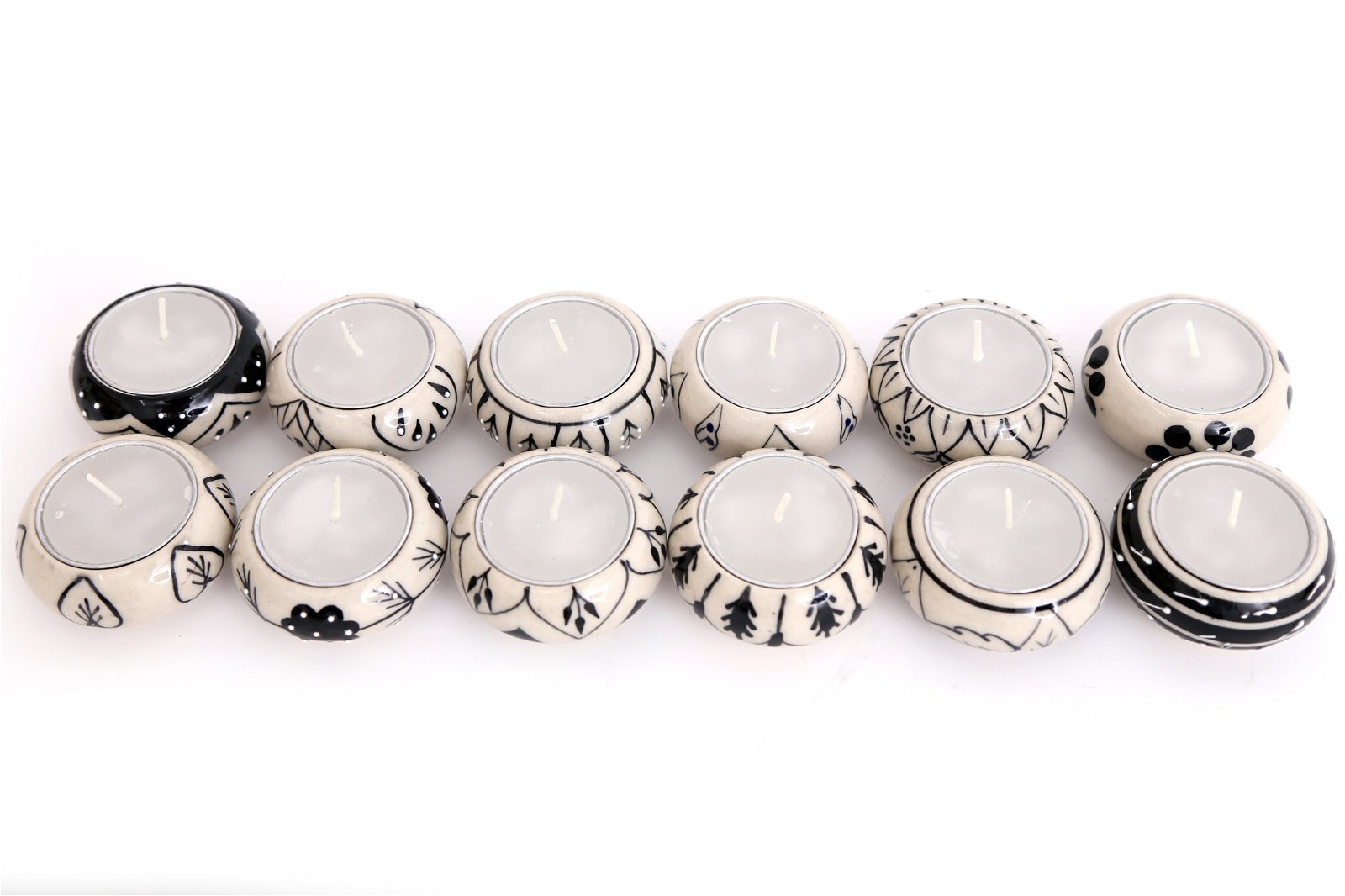 Set of twelve tealights housed in ceramic holders of random black and white designs. The ceramic holders are elegantly glazed and the tealights can be removed and replaced when spent. The gentle glow from a tealight brings warmth to every occasion. Measurements: D6 x H3 x W6cm SKU: CH6117