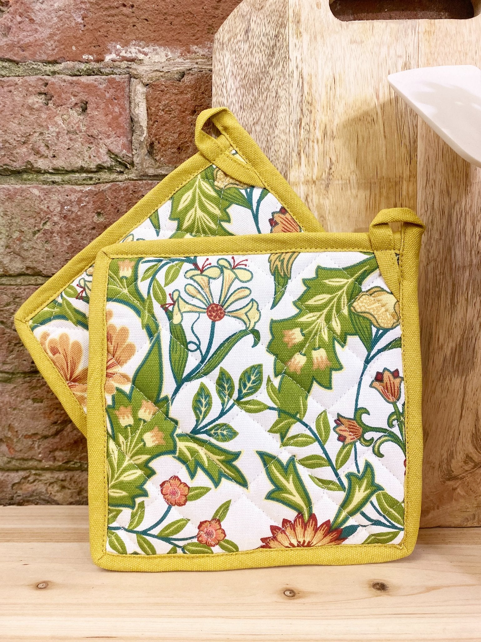 Pack of two pot holders/pot stands from 100% cotton, with hanging loop. Well padded pot stands/pot holders with mustard coloured binding. One side is mustard in colour to match the binding and the other features the Sussex botanical print. Measurements: D21 x H1 x W21cm