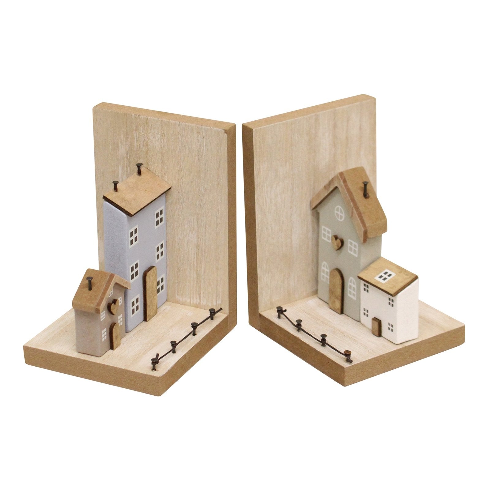 A pair of wooden bookends in our wooden houses design. Finished in neutral colours with cute touches such as picket fences and painted windows. Made of Paulownia Wood and MDF. Each bookend measures W10 D9 H13cm. Measurements: D9 x H13 x W20cm
