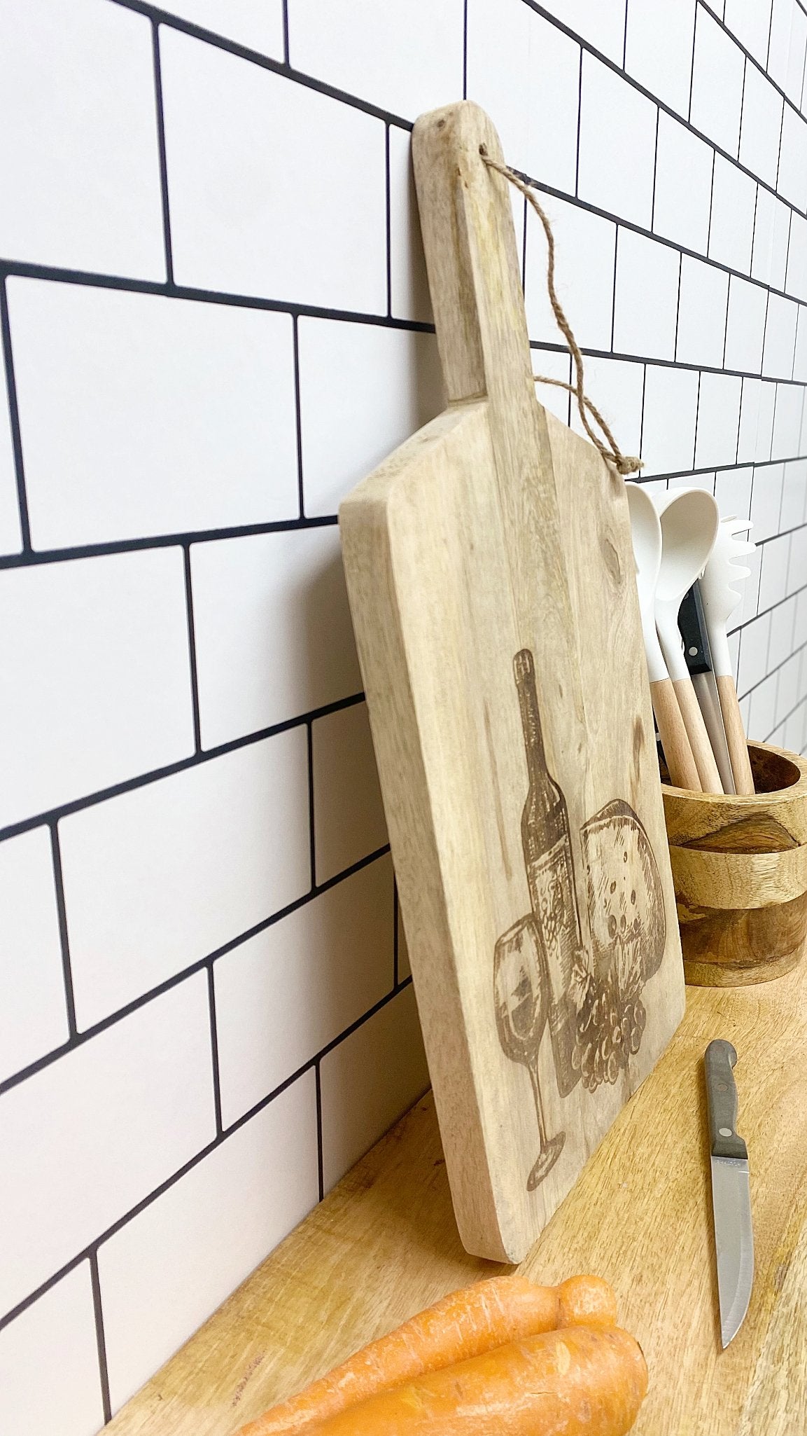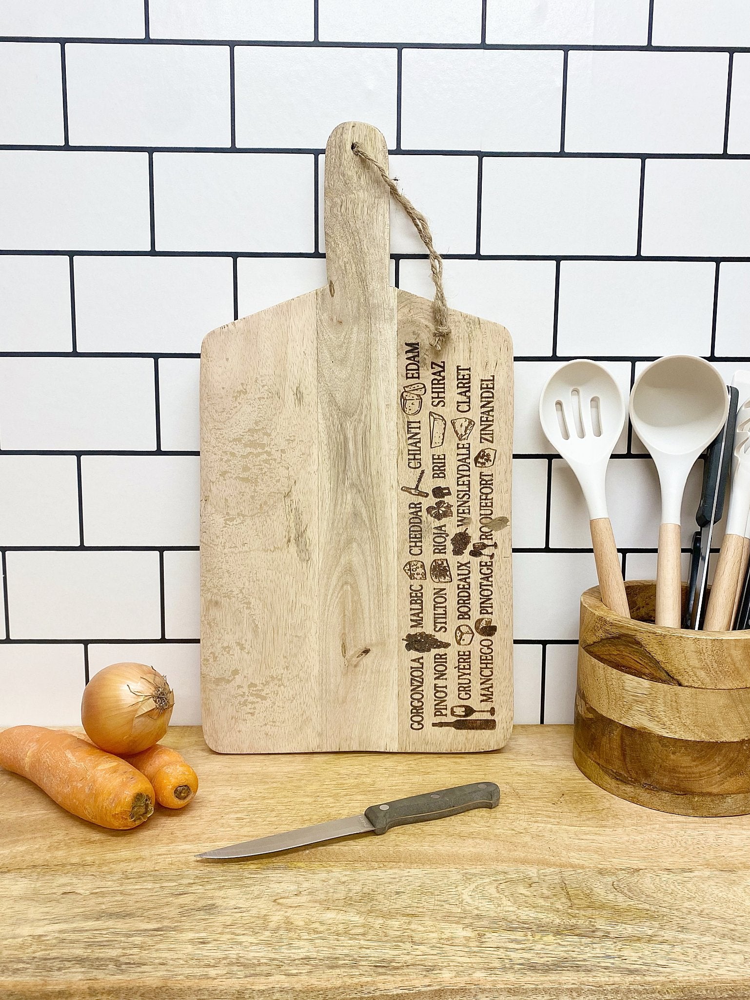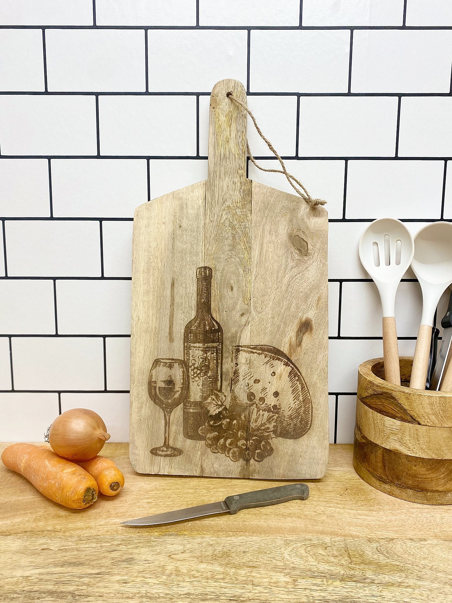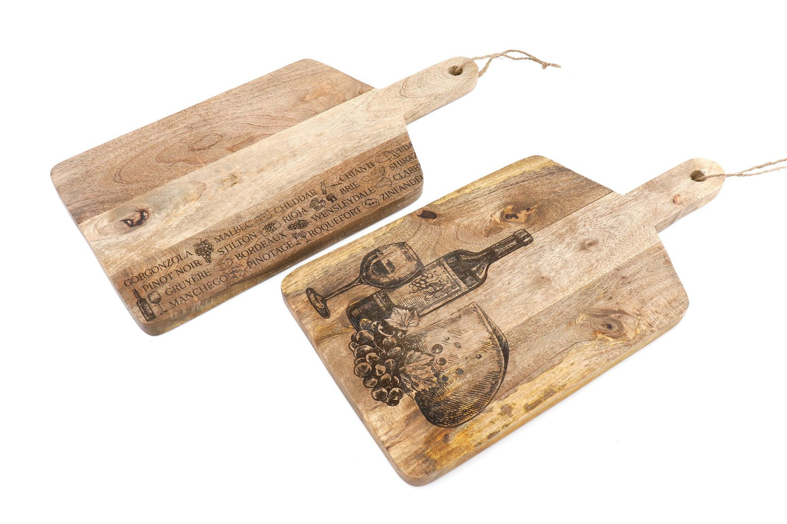 A set of two natural wood engraved chopping boards. One board has the image of a bottle of wine, a glass, cheese selection and a bunch of grapes engraved in the middle of the board. The other board has the names of different wines and cheeses engraved on the right hand side. With jute string loops. The boards are 50cm long including the handle, the main body of the boards are 36cm long. Measurements: D29.5 x H4.3 x W25cm