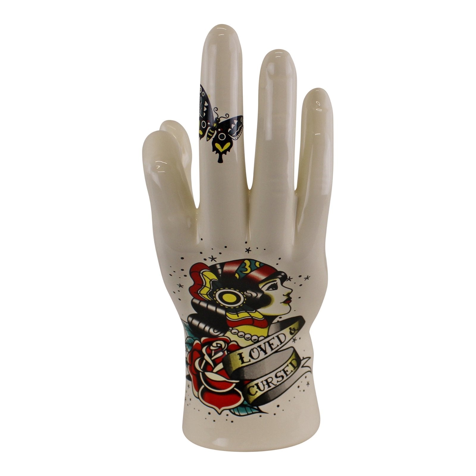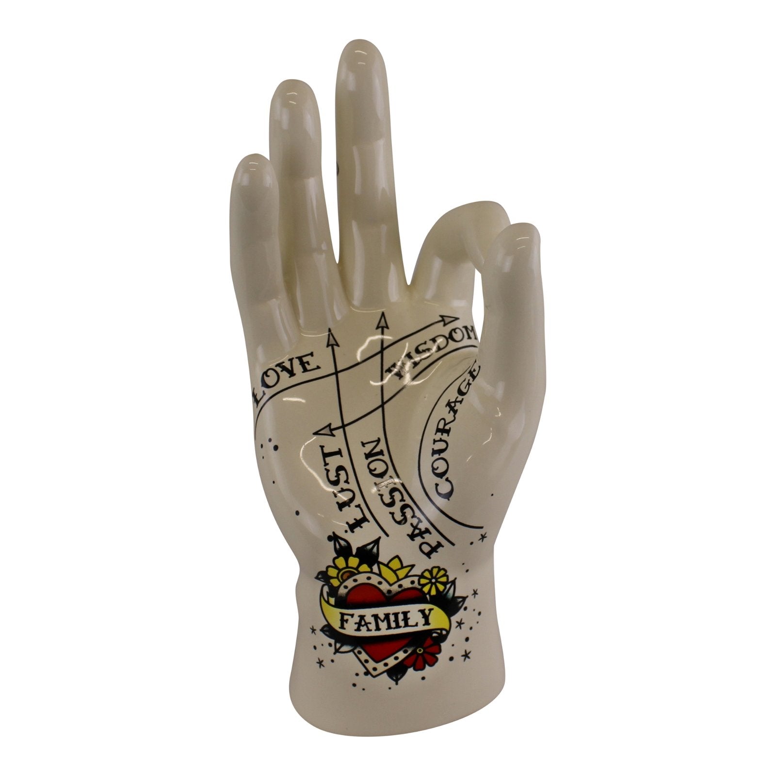 This stunning palmistry ceramic hand has a striking print in the style of a tattoo, if you're looking for something a little different for your home, or a gift for somebody special, this would be perfect! Made of porcelain with a colour design transfer printed. Measurements: 9 x 22.5 x 10cm SKU: TJP0028