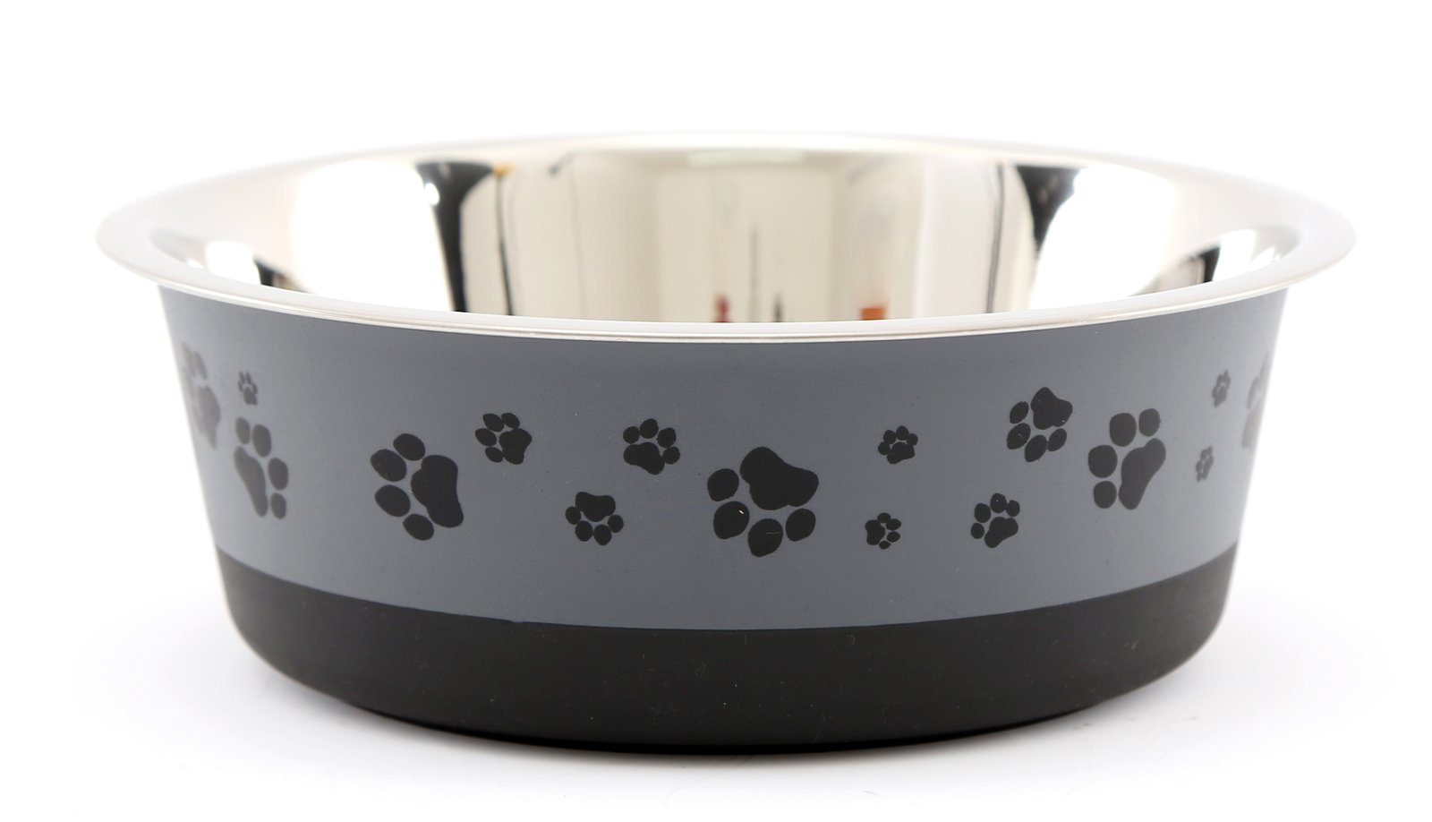 This stainless steel non slip bowl is perfect for a four legged friend's food or water as the non slip bottom means that it wont spill everywhere and the grey and black colours mean it'll fit in any home. Stainless steel bowl with a rubber non slip bottom and black paw prints design and can hold a volume up to 870ml. Measurements: D17 x H6.5 x W17cm SKU: PE1243