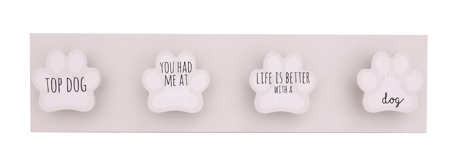 These four dog paw designed coat pegs on which are simple quotes. They are mounted on a neutral plaque and would be ideal to hold lightweight coats, collars, leads or harnesses for a dog. The four Dog hooks have a distance between them of 9cm and the hook heads measure 6x6cm. Overall measurements are: D4 x H10 x W40cm SKU: PG0083