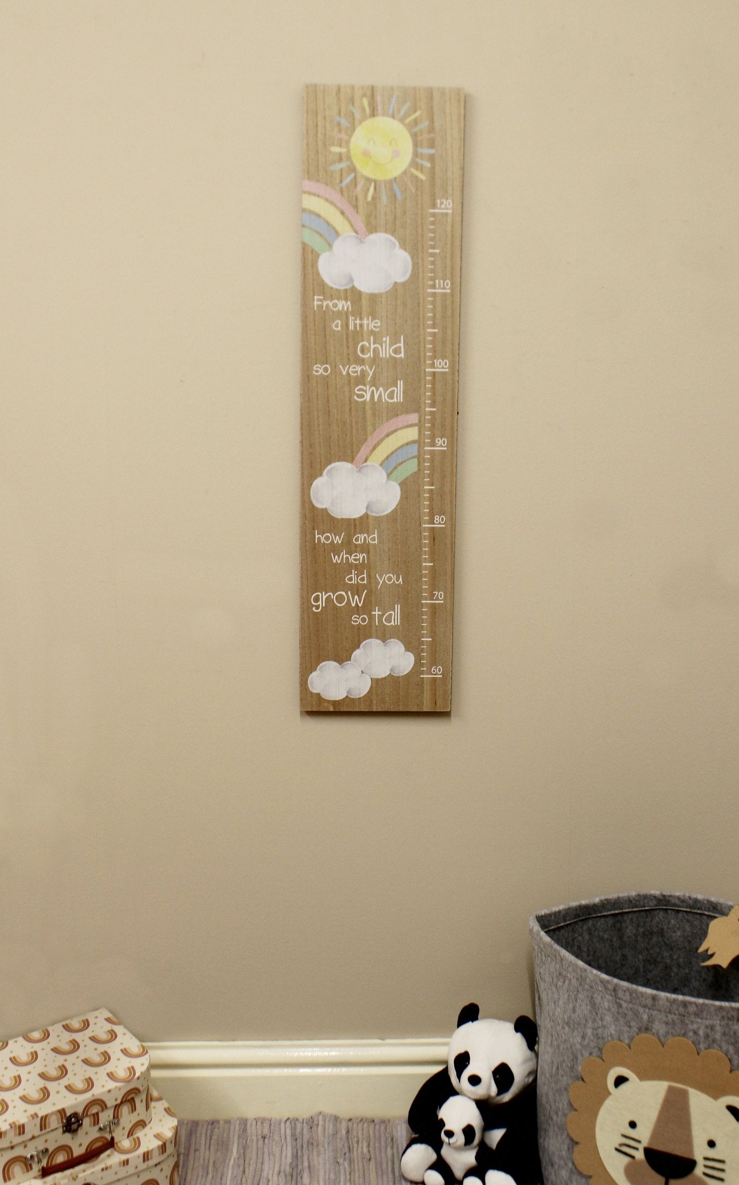 A charming height chart in the style of a giant ruler. Decorated with a painted sunshine and rainbow design. With the words "From a little child so very small, how and when did you grow so tall?" This wall hanging height chart has two eyelet fittings on the reverse, 6.5 cm apart. To be hung 60cm above the floor. Measurements: D2 x H80.5 x W20cm