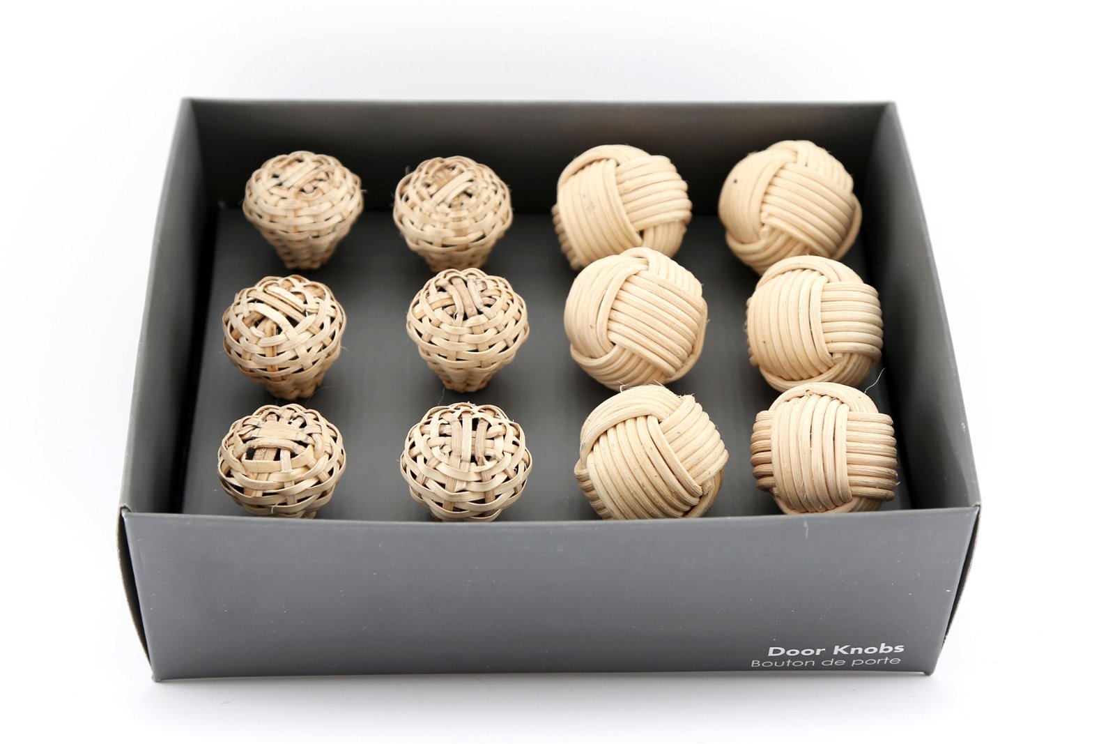 Set of twelve rattan and rope ball design drawer knobs. The Rattan drawer knobs individual weights are 16g. The Rope ball drawer knobs individual weights are 18g. Measurements: D9 x H17.5 x W22cm