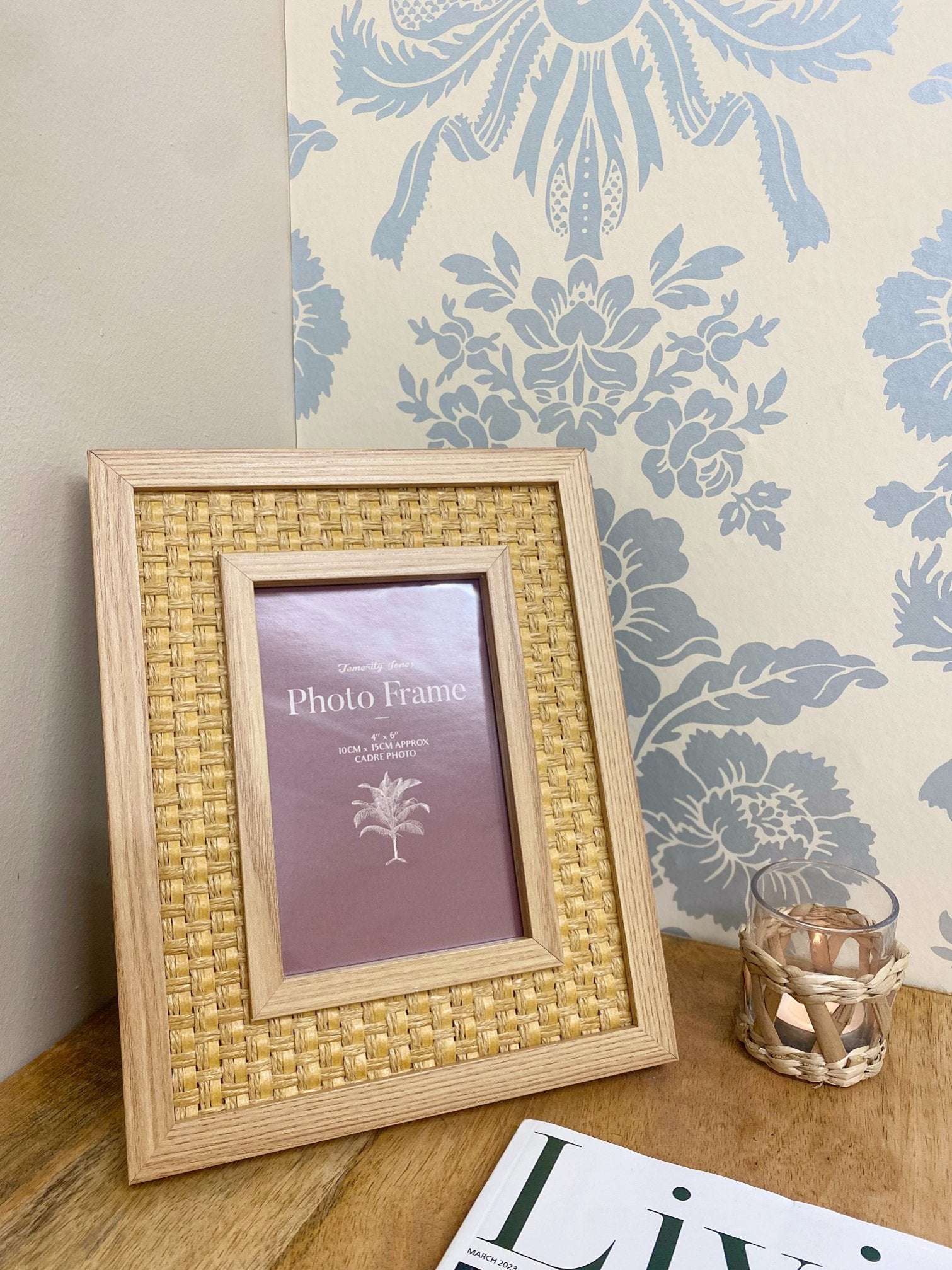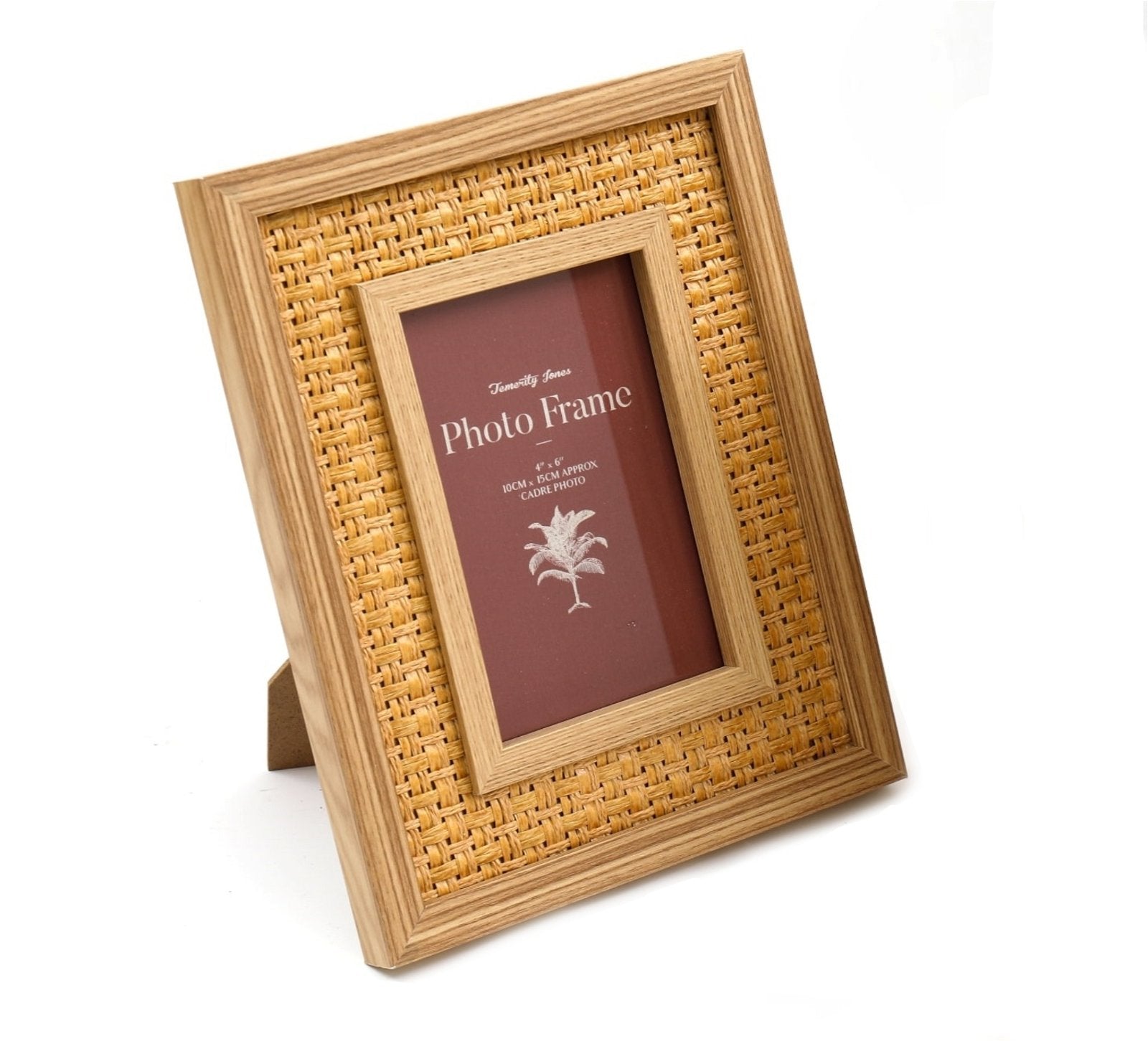 Display your favourite memories with a touch of bohemian texture. This textured photo frame features a woven rattan border in a natural sandy brown.colour Can be displayed portrait or landscape, display freestanding or wall hanging. Measurements: D2 x H25 x W20cm
