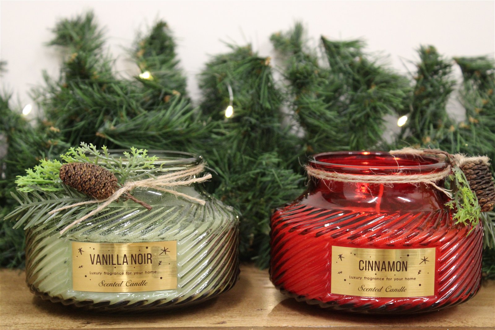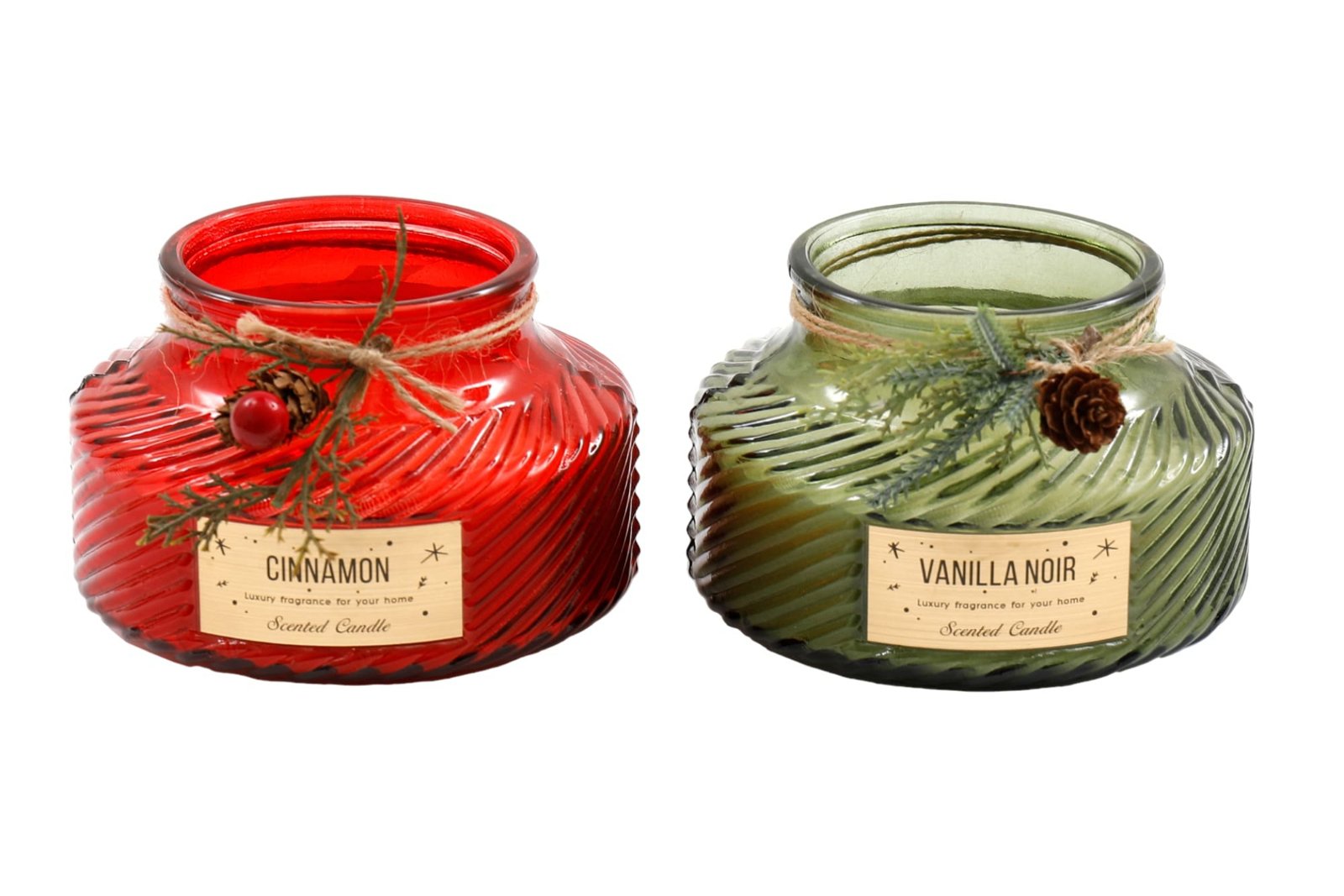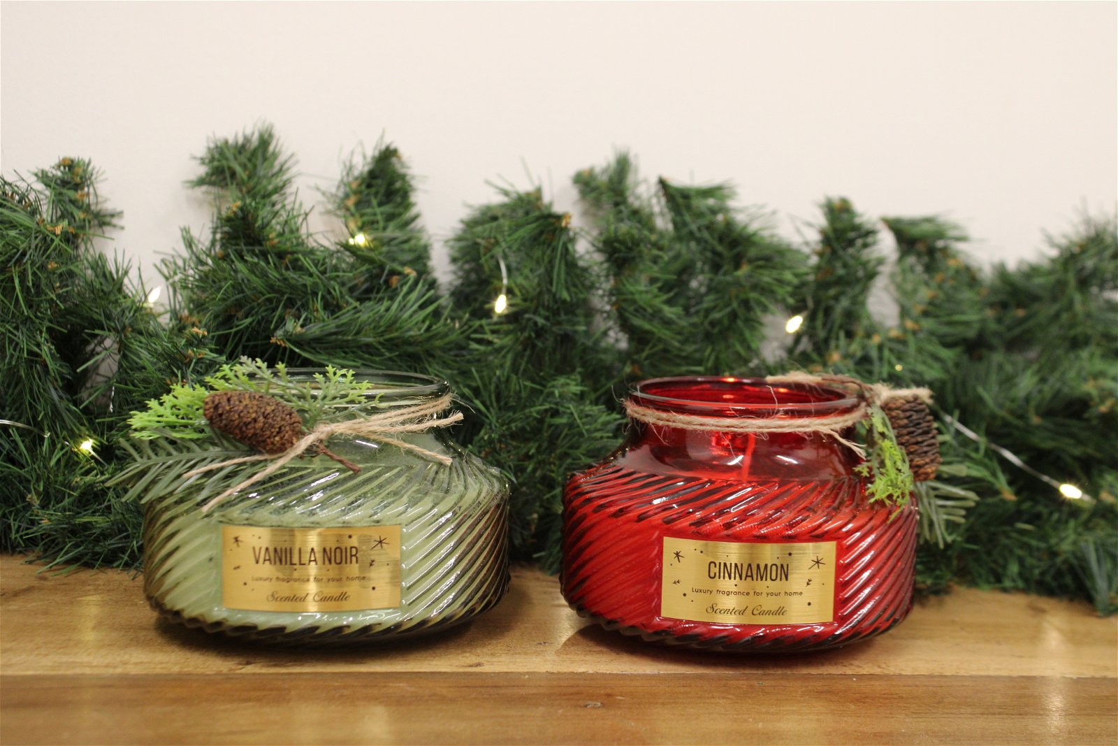 Set of two green and red ribbed glass candle pots with jute string and pine cone decoration. Red glass pot is fragranced with Cinnamon. Green glass pot is fragranced with Vanilla Noir. Measurements: D12.5 x H8 x W12.5cm