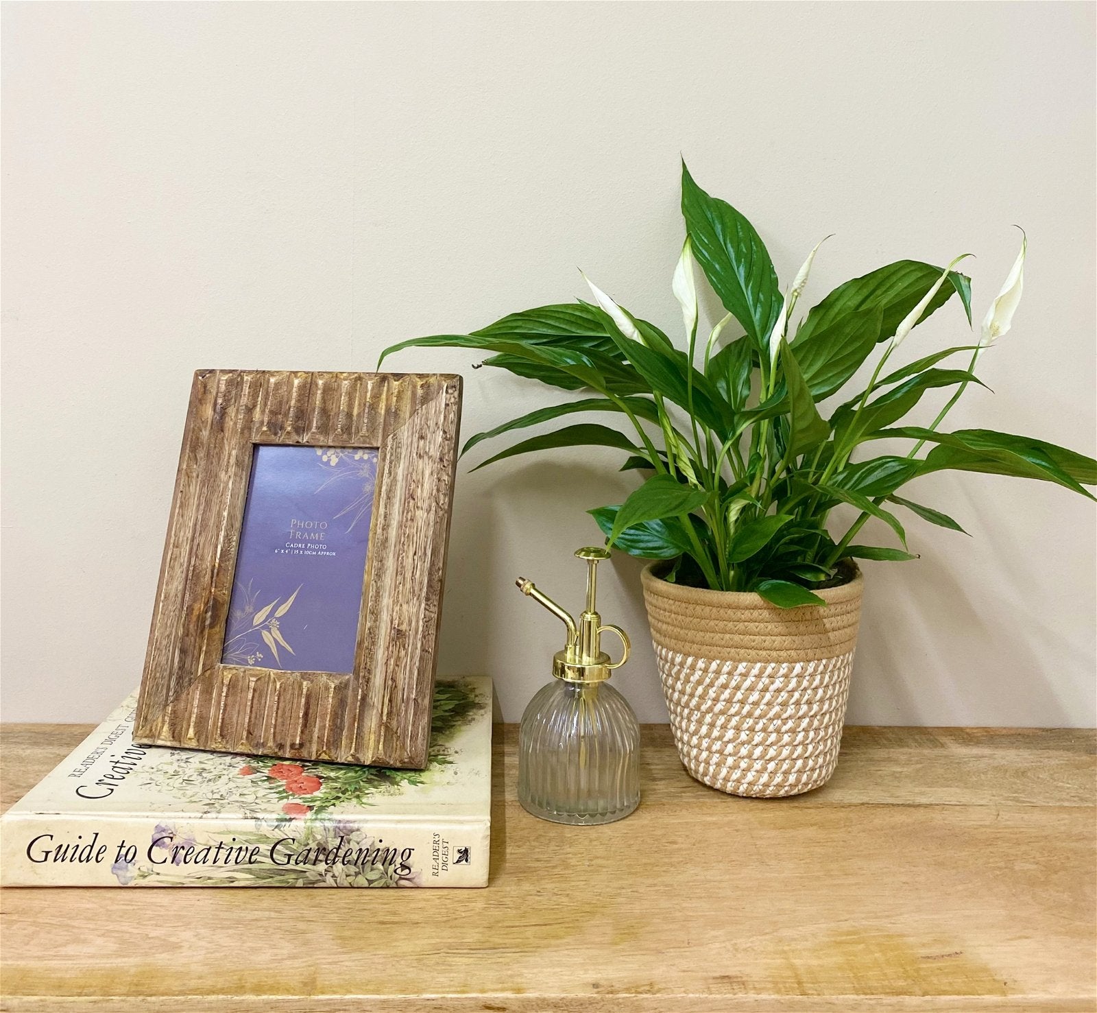 A ribbed wooden photo frame, made from Mango wood with a grooved texture on its surface. The texture adds visual interest to the frame and enhances the overall aesthetic of the photograph it holds. Colour of wood may vary slightly due to the frame being made 100% natural mango wood. Measurements: D2 x H24 x W19.5cm