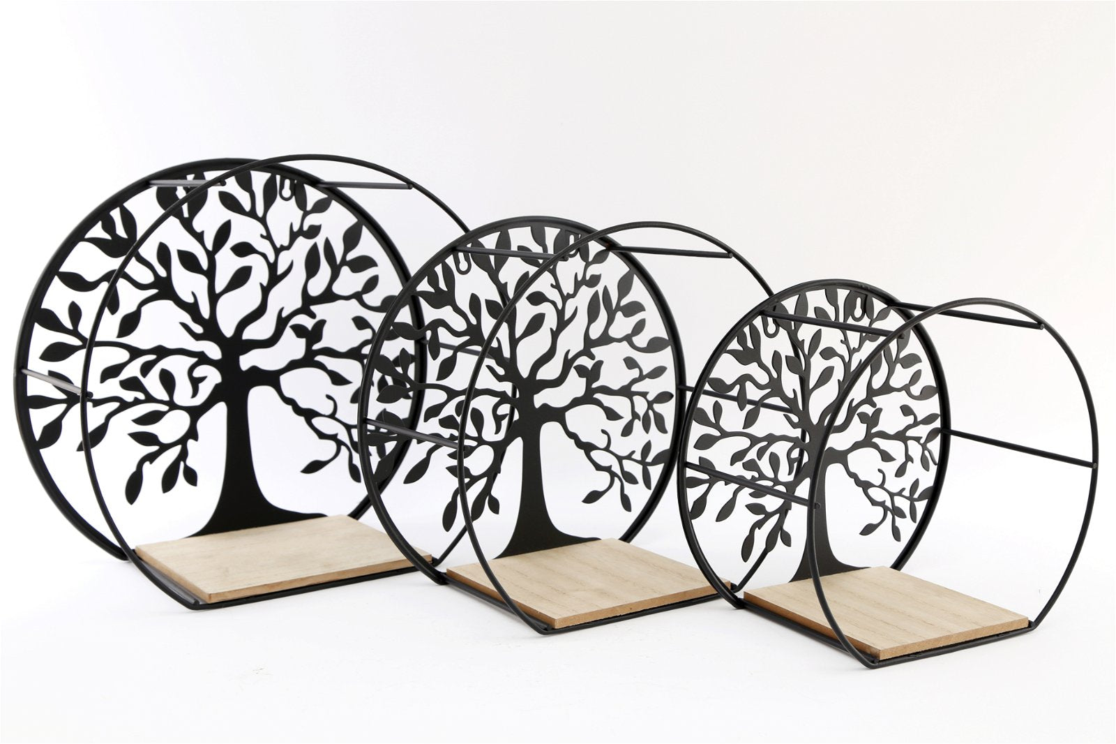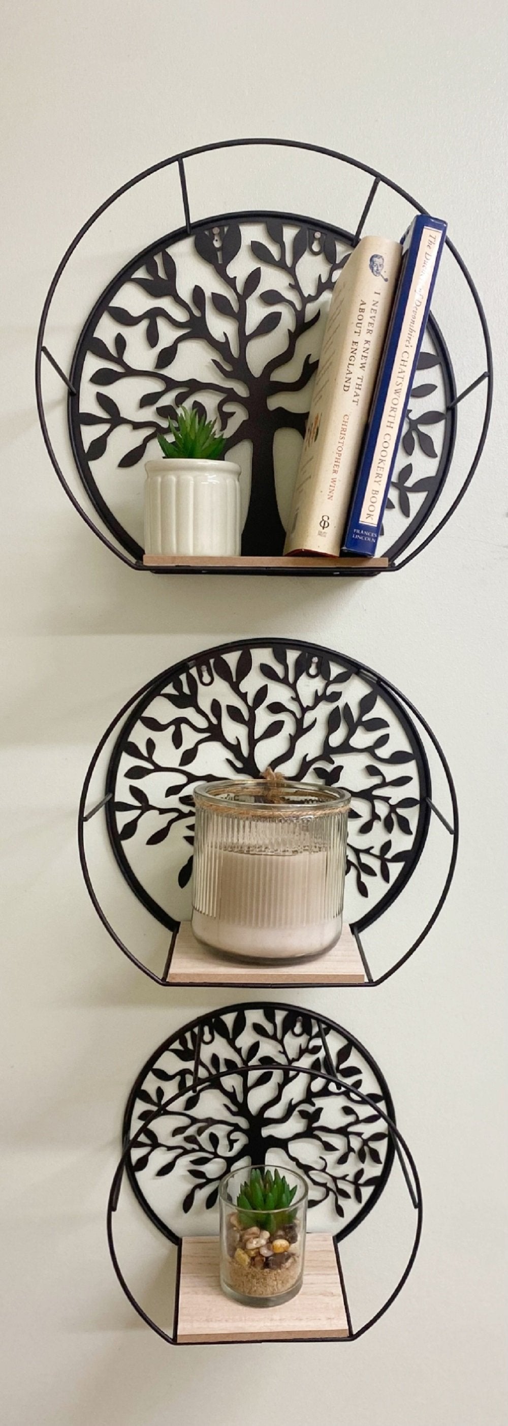 A set of three black wire frames with a shelf and tree of life cut out. These three attractive shelf units are in three sizes of the same design. A black silhouette tree of life is the background for the black wire frame surround, hosting a shelf at the base. The architecture and clean crisp lines are appealing and would certainly compliment any contemporary home. Largest measurements: D13.7 x H28 x W30.5cm Medium measurement: D13 x H24.5 x W13 Small measurement: D12.5 x H21 x W12.5cm