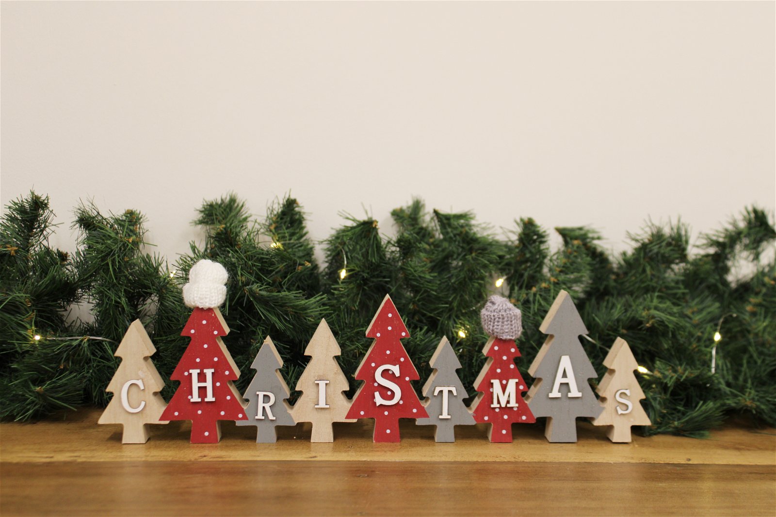 A wooden free-standing Christmas display sign with miniature knitted hats. Some of the trees are painted Red and Grey, decorated with a spotty finish. Measurements: D2 x H11 x W40cm