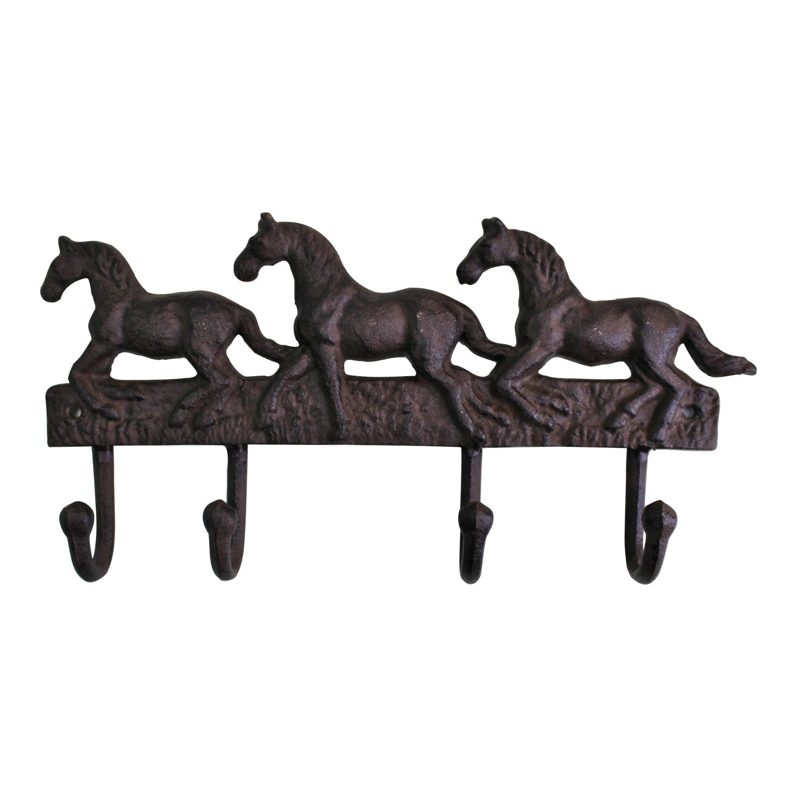 These Rustic Metal Wall Hooks are an ideal wall decor choice for those who prefer industrial style and metal home accessories. Made of metal, this item includes 4 coat hooks with 3 horses above and has a rustic, heavily distressed finish. Ideal wall storage for a bathroom, kitchen, hallway or bedroom space. This item could be used to store coats, dressing gowns, towels. Ideal for those who prefer a rustic finish and small space storage accessories. Part of a wide variety of Wall Hooks available in a selection of sizes, colours and styles. Holes for easy fixing to walls (wall fixings not included) Measurements: 5 x 16.5 x 34cm
