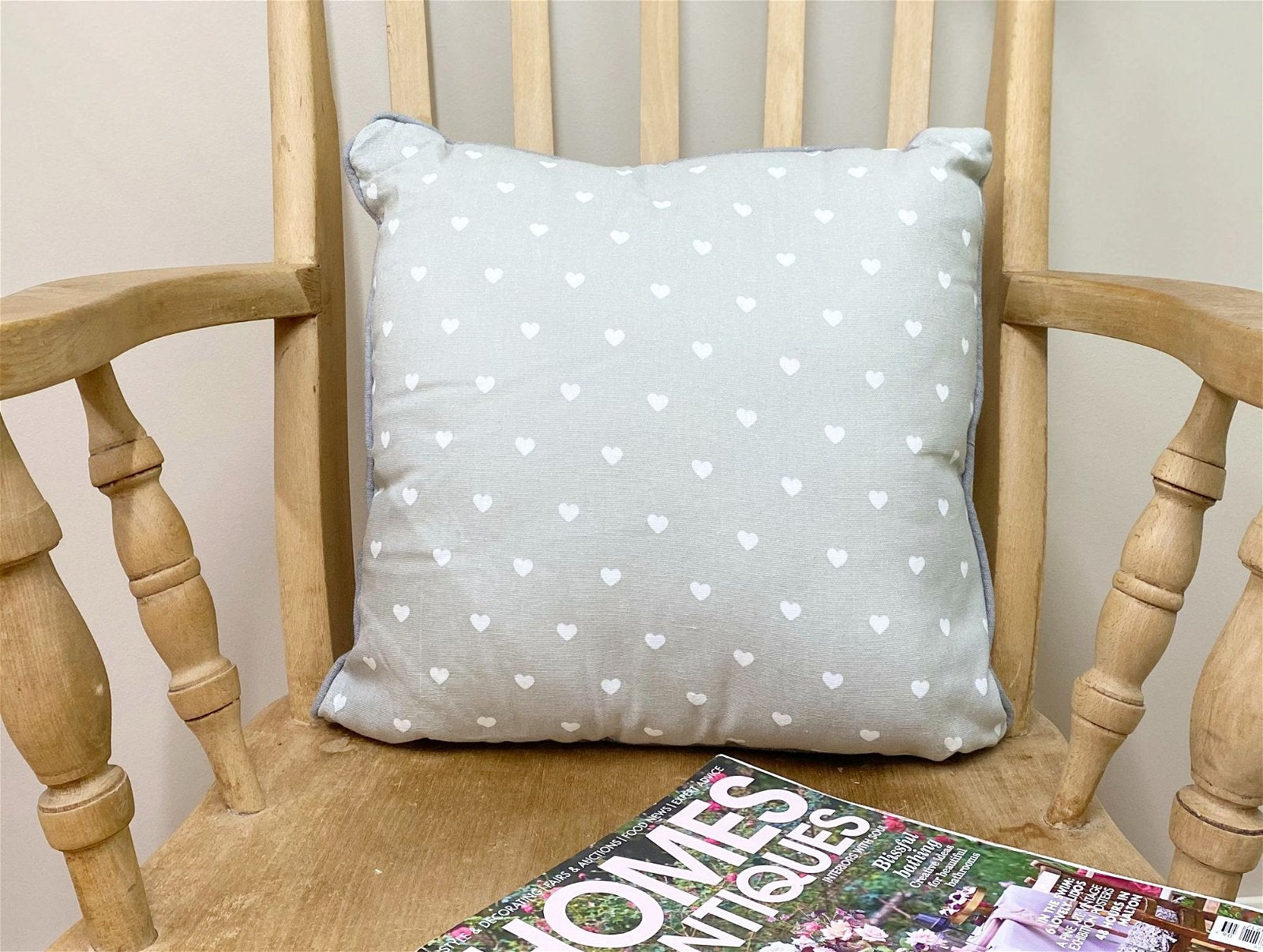 A scatter cushion with removable cover. Printed on one side with the heart print design and contrasting subtle mid grey on the reverse. Part of a country kitchen collection. Overall measurements: D15 x H37 x W37cm SKU: KG1133