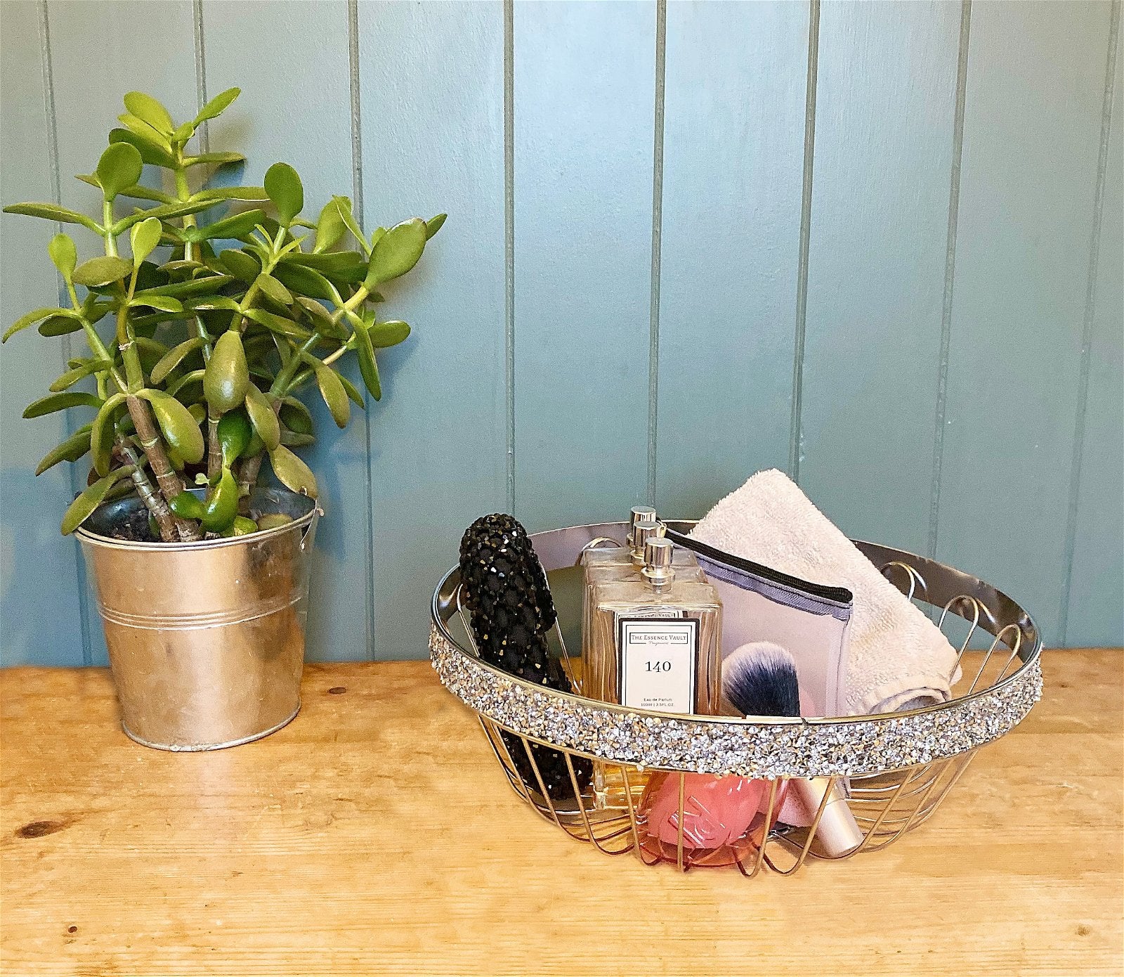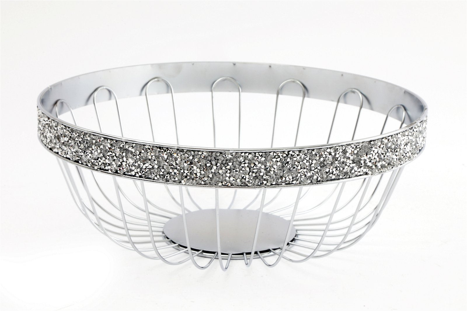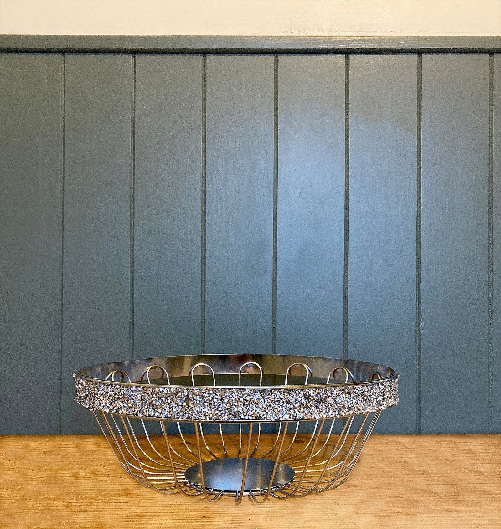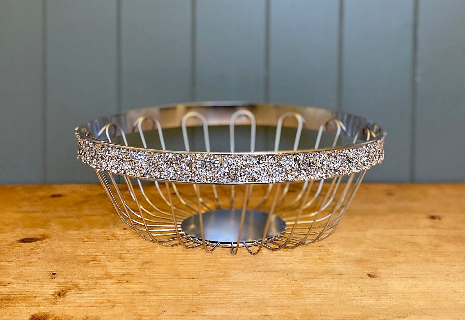 A silver chrome bowl/basket with a scatter gem band around the top. This stylish bowl has a solid chrome base 10cm diameter and a sparkly band, width 2.5cm. A truly beautiful home accessory that will blend well with a range of interiors. Measurements: D11.5 x H29 x W29cm