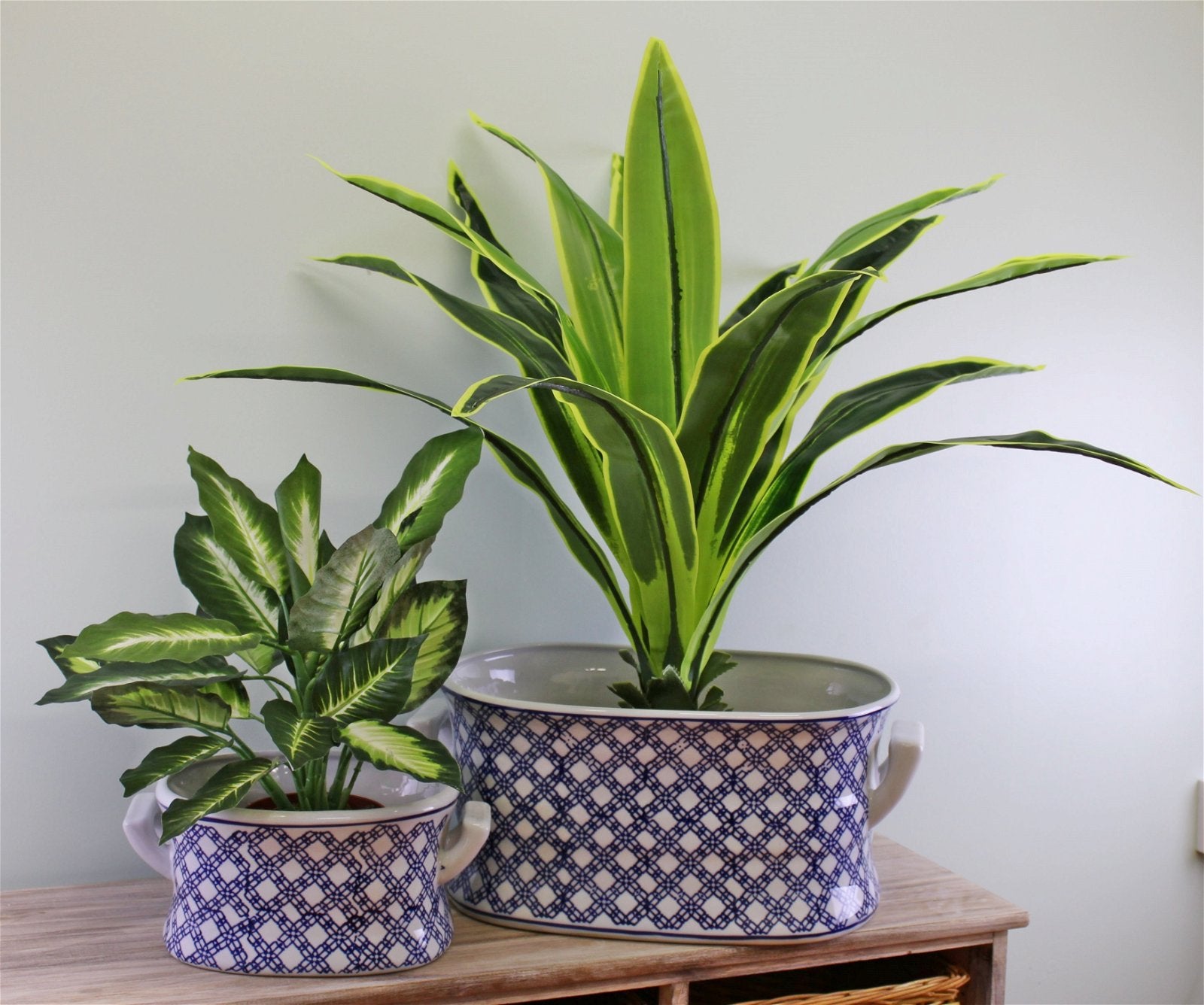 A set of 2 glazed ceramic footbath style planter with a vintage blue and white geometric design. These planters will make stylish displays of your plants in the home or on the patio. Could also be used for other decorative purposes such as filling with artificial flowers or pot pourri. The pots are ceramic with a transfer printed design. Individual pot sizes, Large W49 D31 H22cm. Small W32 D22 H15cm. Measurements: 31 x 22 x 49cm