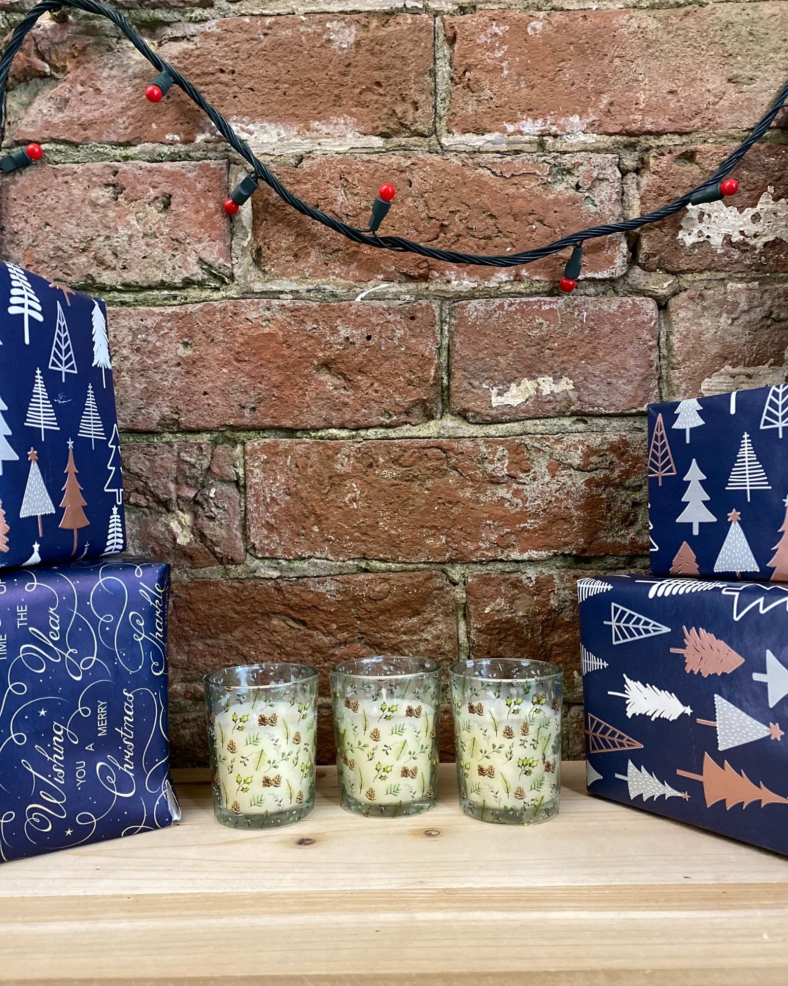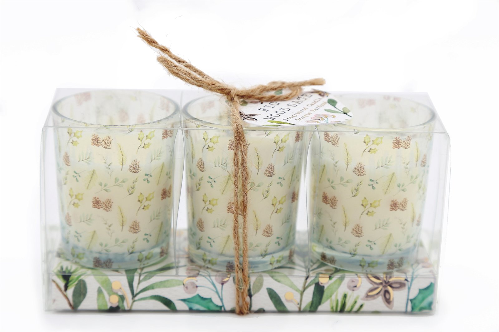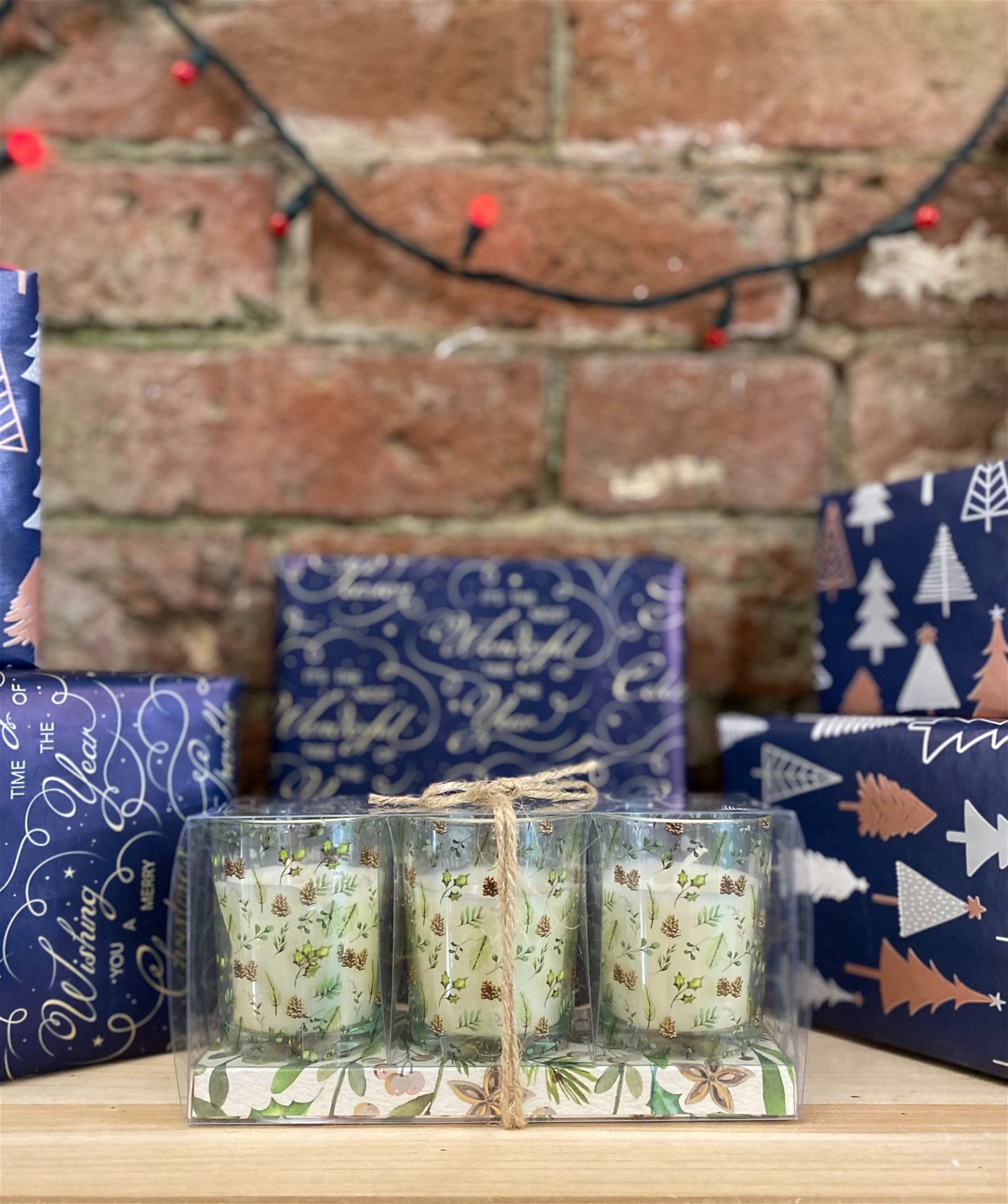 Set of 3 Fig & Wood Sage fragranced candles. A set of three festive white candles each in a glass pot with Christmas foliage design. These are a lovely decoration for any room. Each candle measures 5cm in diameter with a 6cm height. This item comes gift boxed and would make a perfect gift. Overall boxed measurements: d5 x h8 x w16cm