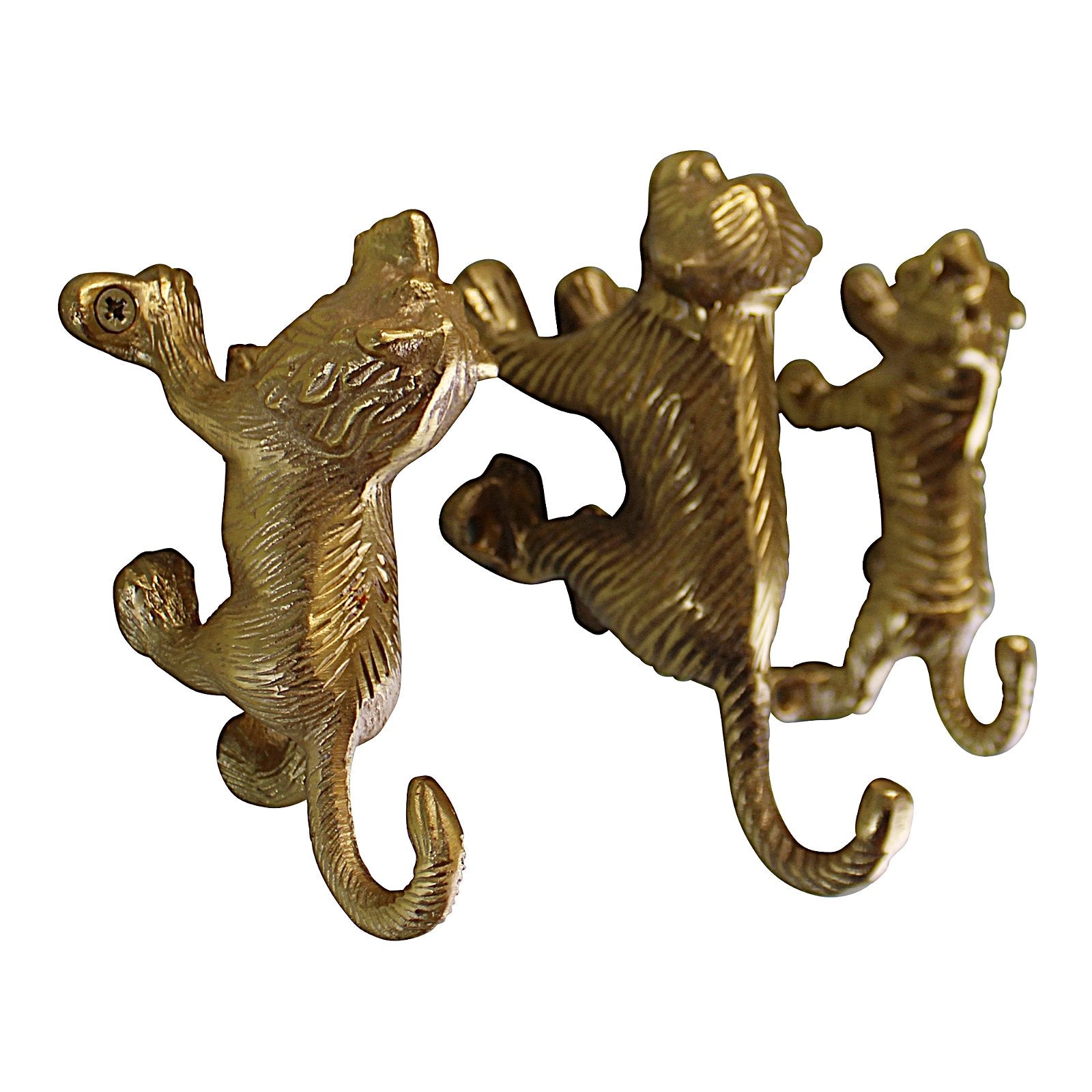 3 small cast metal coat hooks, a lion, tiger & monkey with the tails as hooks. Beautiful, quirky coat hangers to brighten any room. Made of aluminium and finished in a gold colour with 2 fittings to each hook for wall hanging. Measurements: 9 x 14 x 17cm SKU: TJN0238