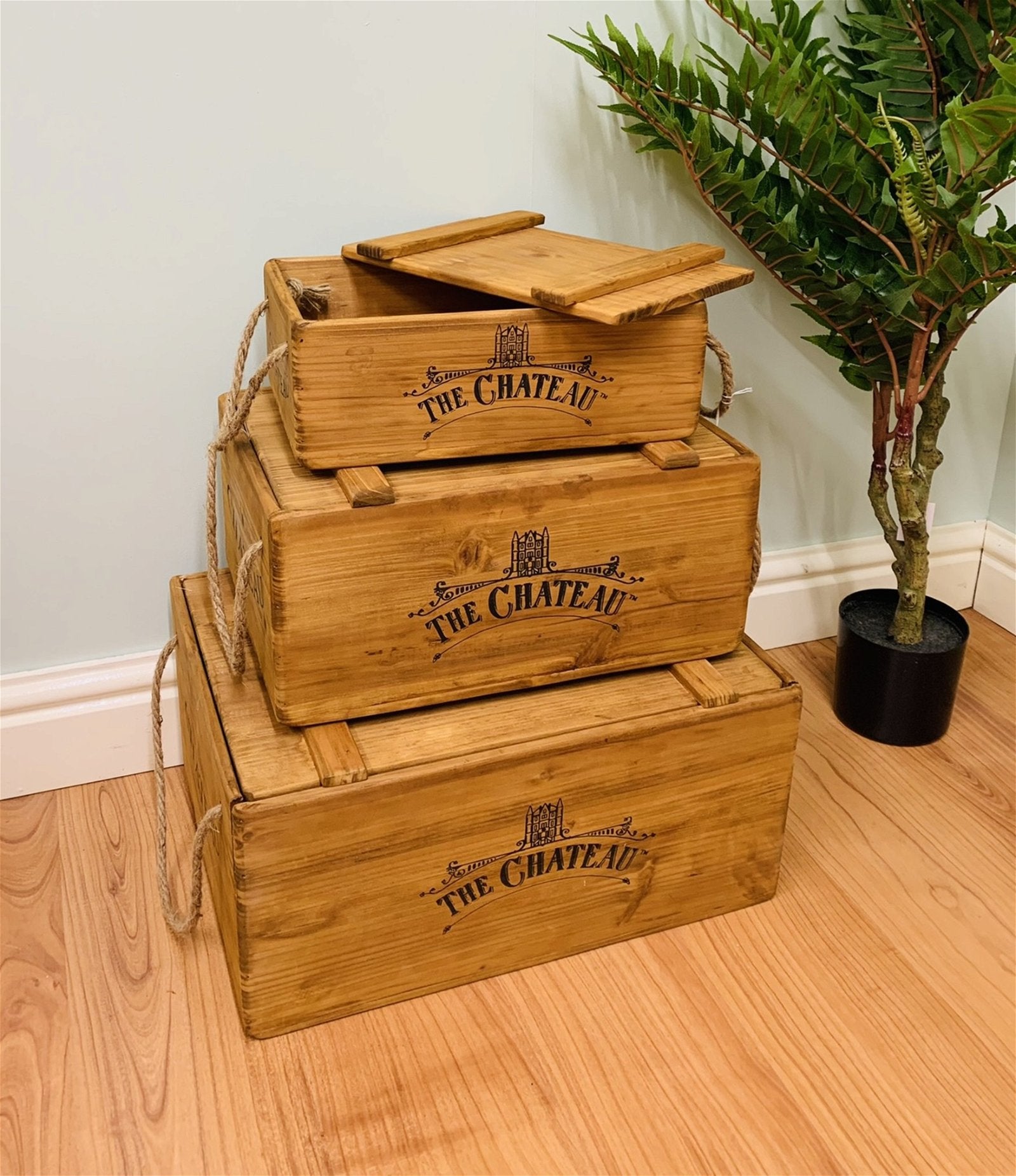 A set of three burnt effect wooden rectangular crate with a logo 'The Chateau'. Each crate has a lid and two rope handles making them great for moveable storage in the bedroom or a stackable feature in any room. The large crate measures 34x21.5x45cm and the handles extend 18 cm. The medium crate measures 27x38x18cm with the rope handles extending 16cm. The small crate measures 20x31x12cm with the rope handles extending 13cm. Overall measurements are: D34 x H21.5 x W45cm SKU: SG0284