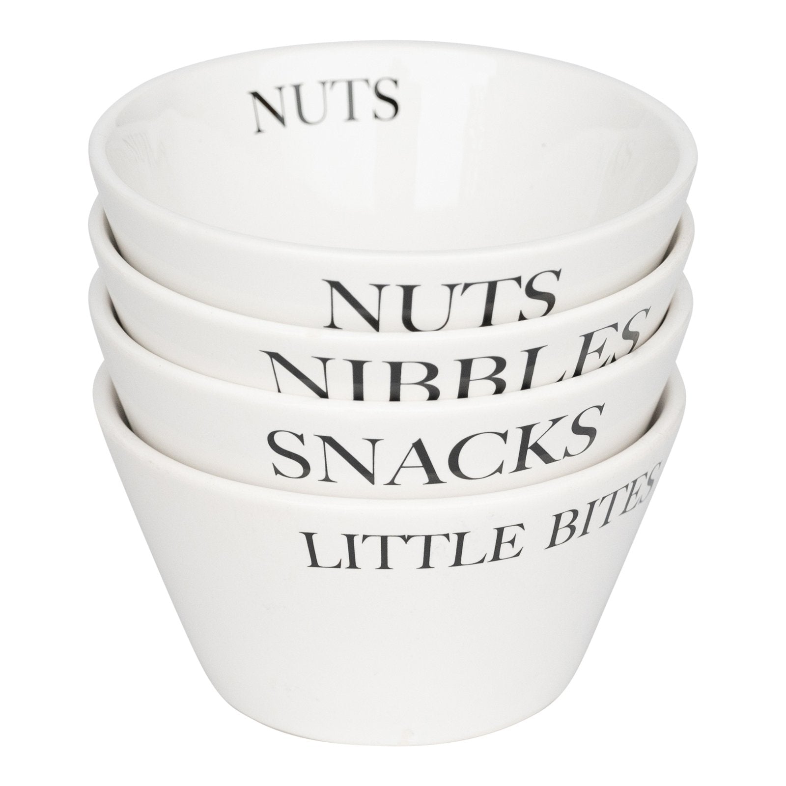 This set of four round white snack bowls has black text with nibbles, little bites, nuts and snacks on them. Would be perfect for al fresco dining and ideal for entertaining at home. Each of the bowls has a top diameter of 11.5cm and a base of 6.5cm with a depth of 6cm. The measurements for each bowl are: D11.5 x H6 x W11.5cm SKU: OR0481