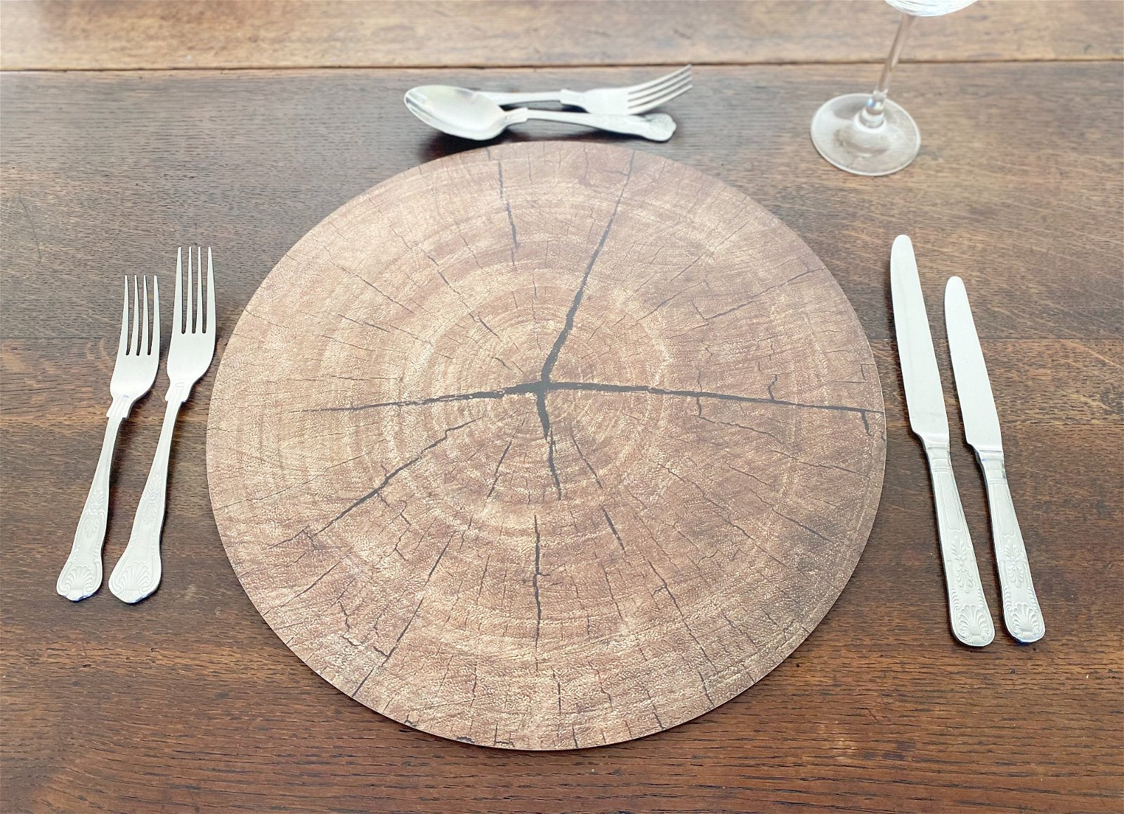 A set of four place mats with a printed wood effect and a cork base. Each mat has a diameter of 38cm. This functional set with a wipeable surface would look stylish in any home. Set Measurements: D38 x H1 x W38cm