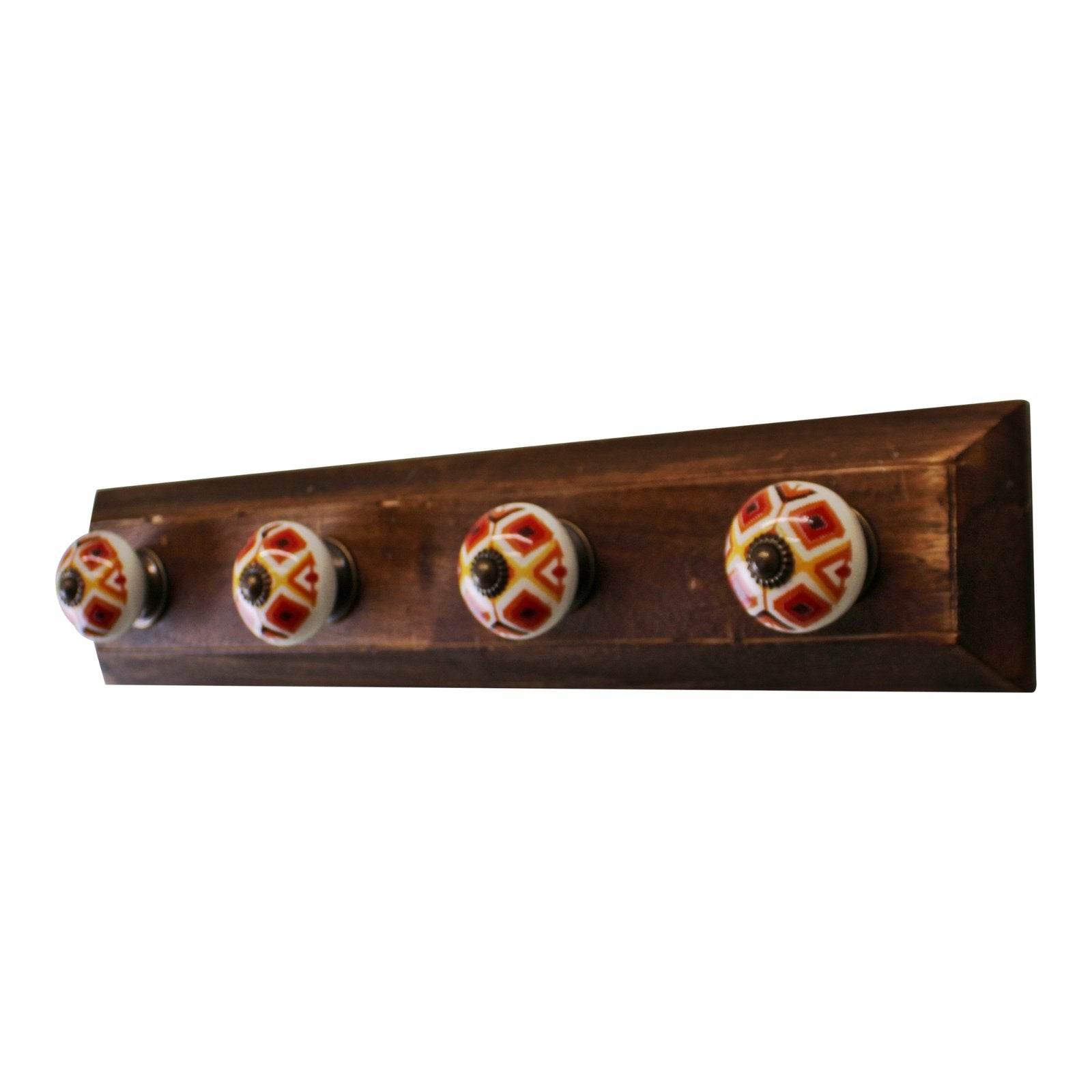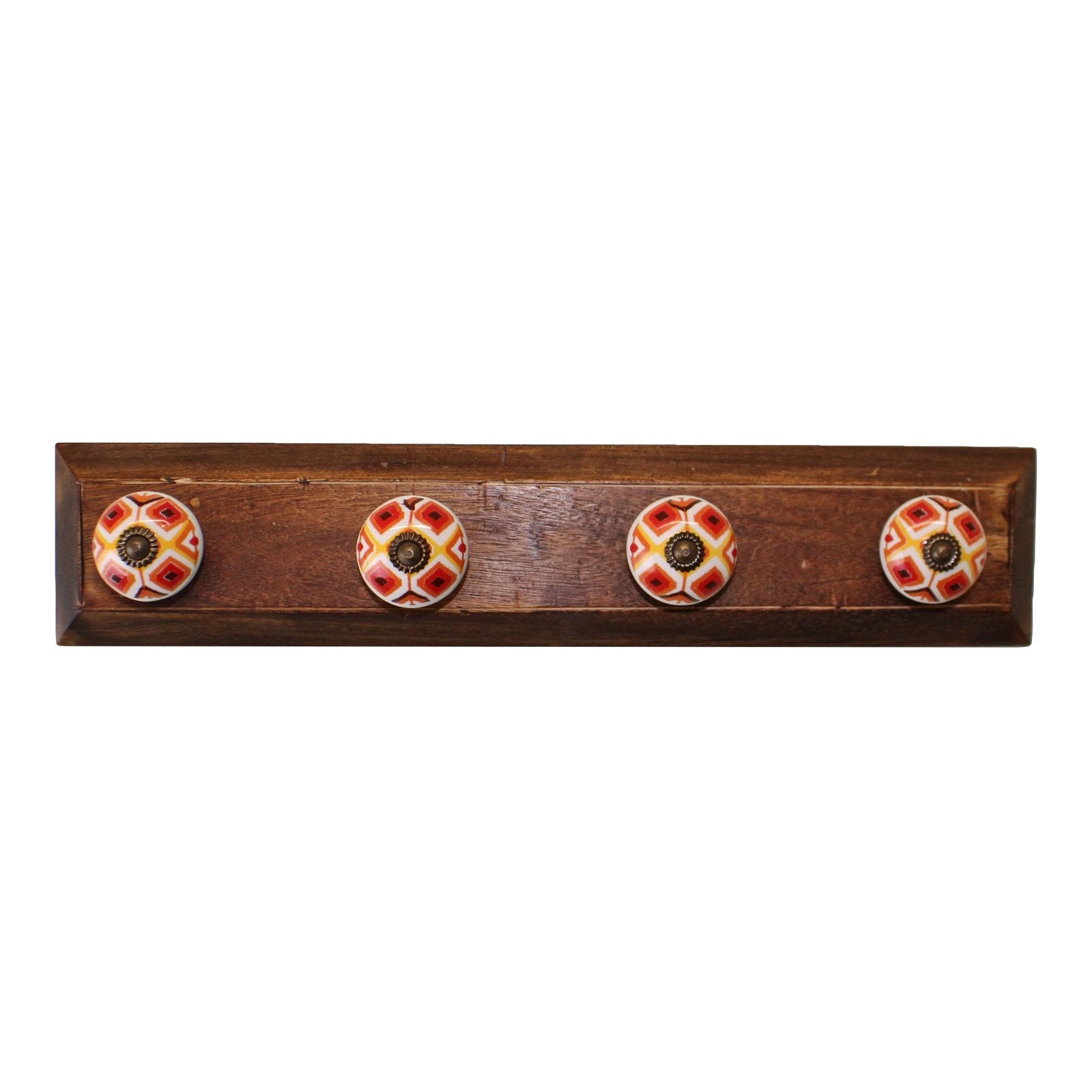4 Kasbah design ceramic, stoneware coat hooks on a solid wood base. The base is solid mango wood with 4 ceramic stoneware hooks with iron detailing. Measurements: 5 x 7.8 x 38cm SKU: KA0096