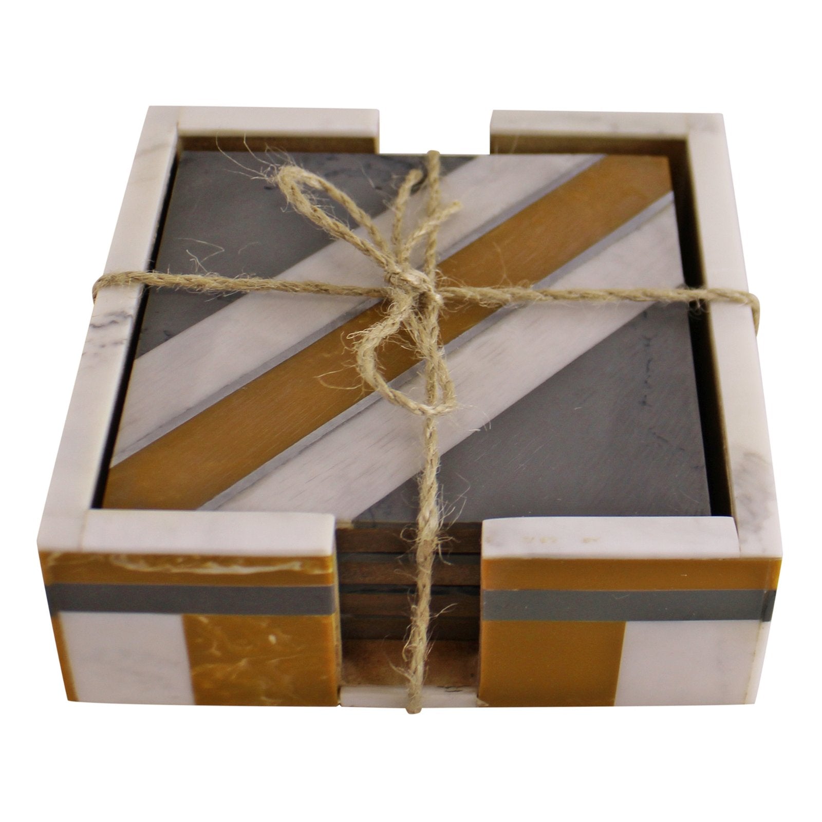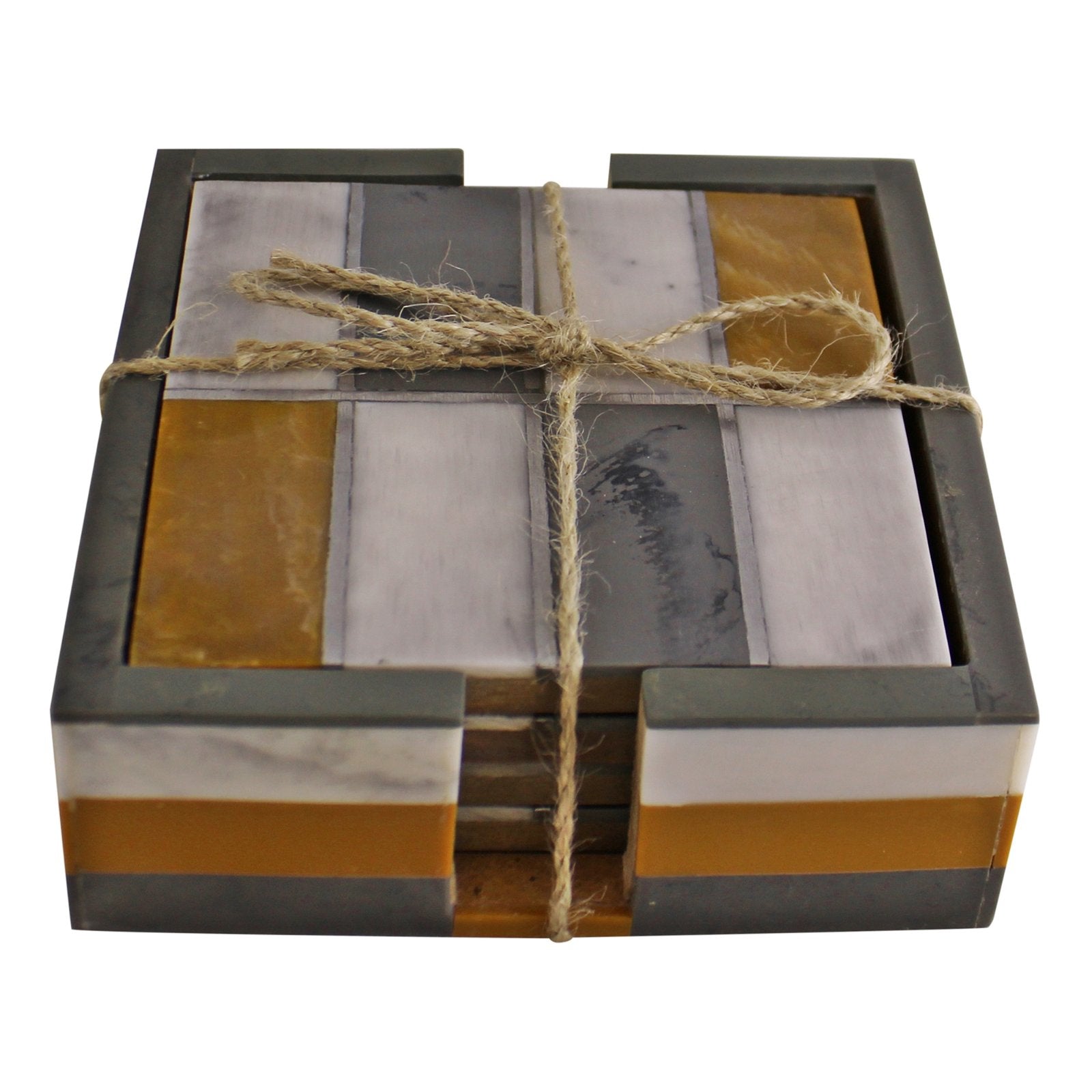 A set of 4 resin drinks coasters in a holder with a contemporary abstract design. There are 3 slightly different designs and these will be sent out randomly from the warehouse. The coasters measure 10cm square. The coasters are made of resin with an MDF backing. Measurements: 12 x 4 x 12cm SKU: AB0039