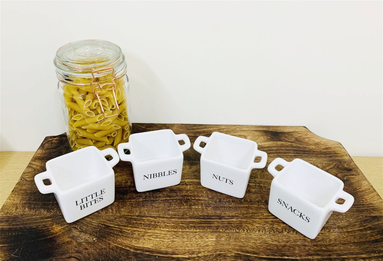This set of four square white snack bowls has black text with nibbles, little bites, nuts and snacks on them. Would be perfect for al fresco dining and ideal for entertaining at home. Each of the pots has handles of 1.5x 3.5cm. The inner dimensions are 6x5.5x4cm. The measurements for each bowl are: D7 x H20.5 x W10cm SKU: OR0482