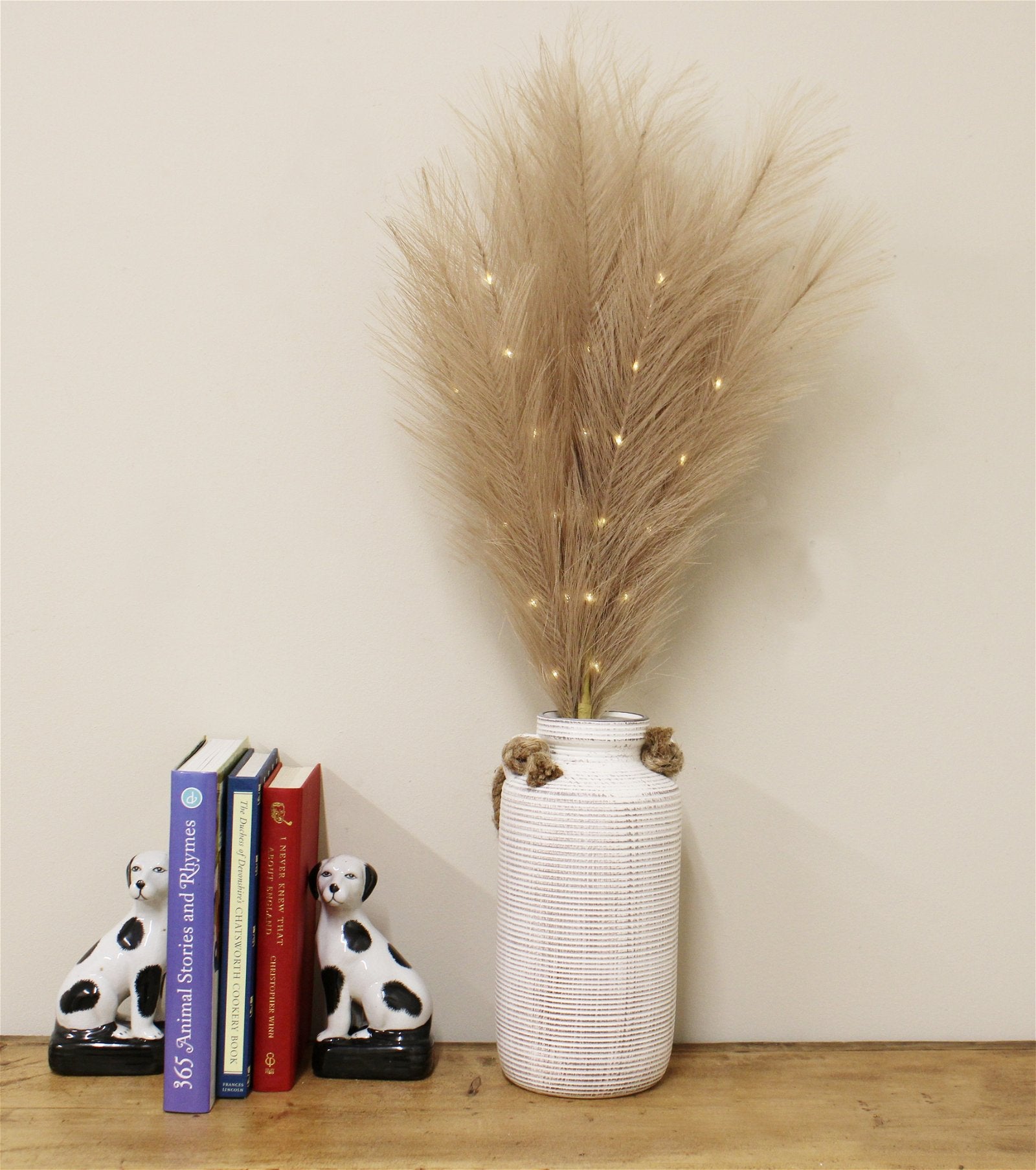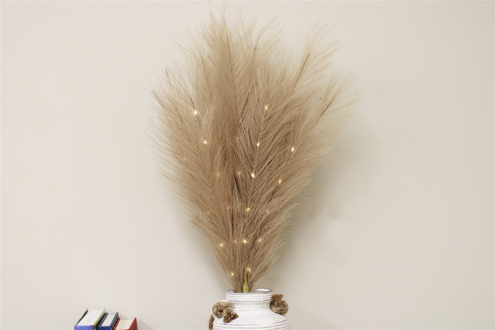 Set of five realistic looking pampas stems, in a natural brown colourway. Three of the stems are intricately entwined with warm glowing LED lights. These natural toned pampas stems will tie in with any home decor, they would also make a great gift idea. Requires two AA batteries, please note batteries are not included. This item has three modes, on, off and timer. The timer switch is the last click on the battery compartment. If using the timer mode the lights will stay on for six hours, then off for eighteen hours in a continuous rotation. Measurements: D3 x H80 x W9cm