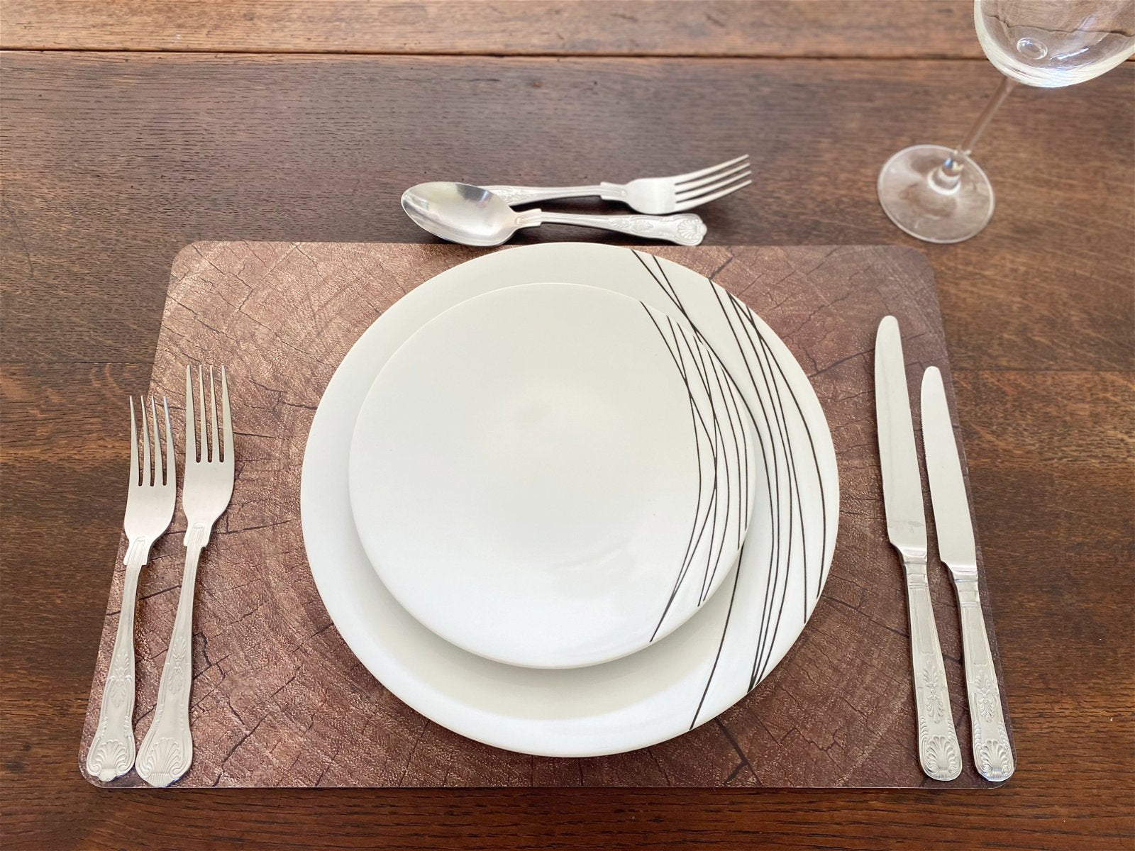 A set of four place mats with a printed wood effect and a cork base. Each mat has dimension of 45cm x 30cm. This functional set with a wipeable surface would look stylish in any home. The set measurements are: D1 x H30 x W45cm