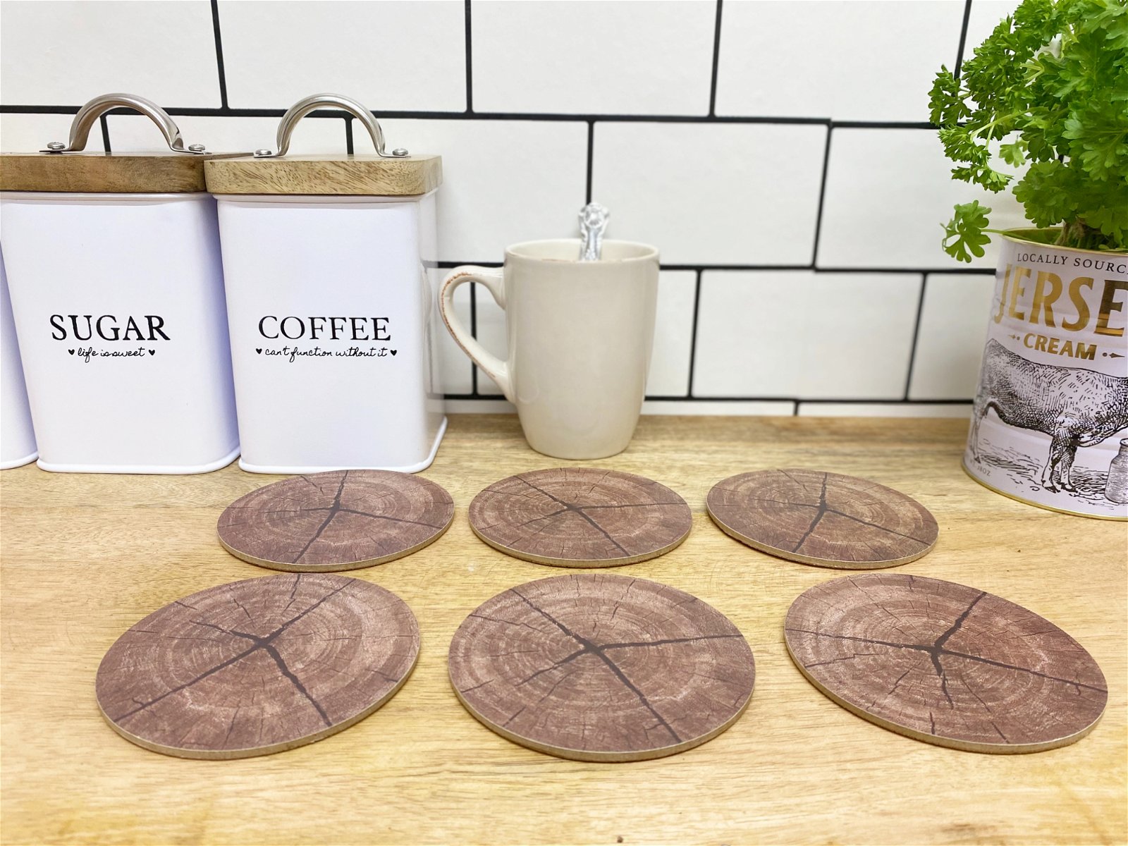 A set of six coasters with a printed wood effect and a cork base. Each coaster has a diameter of 10cm. This functional set with a wipeable surface would look stylish in any home. The set measurements are: D10 x H2.5 x W10cm