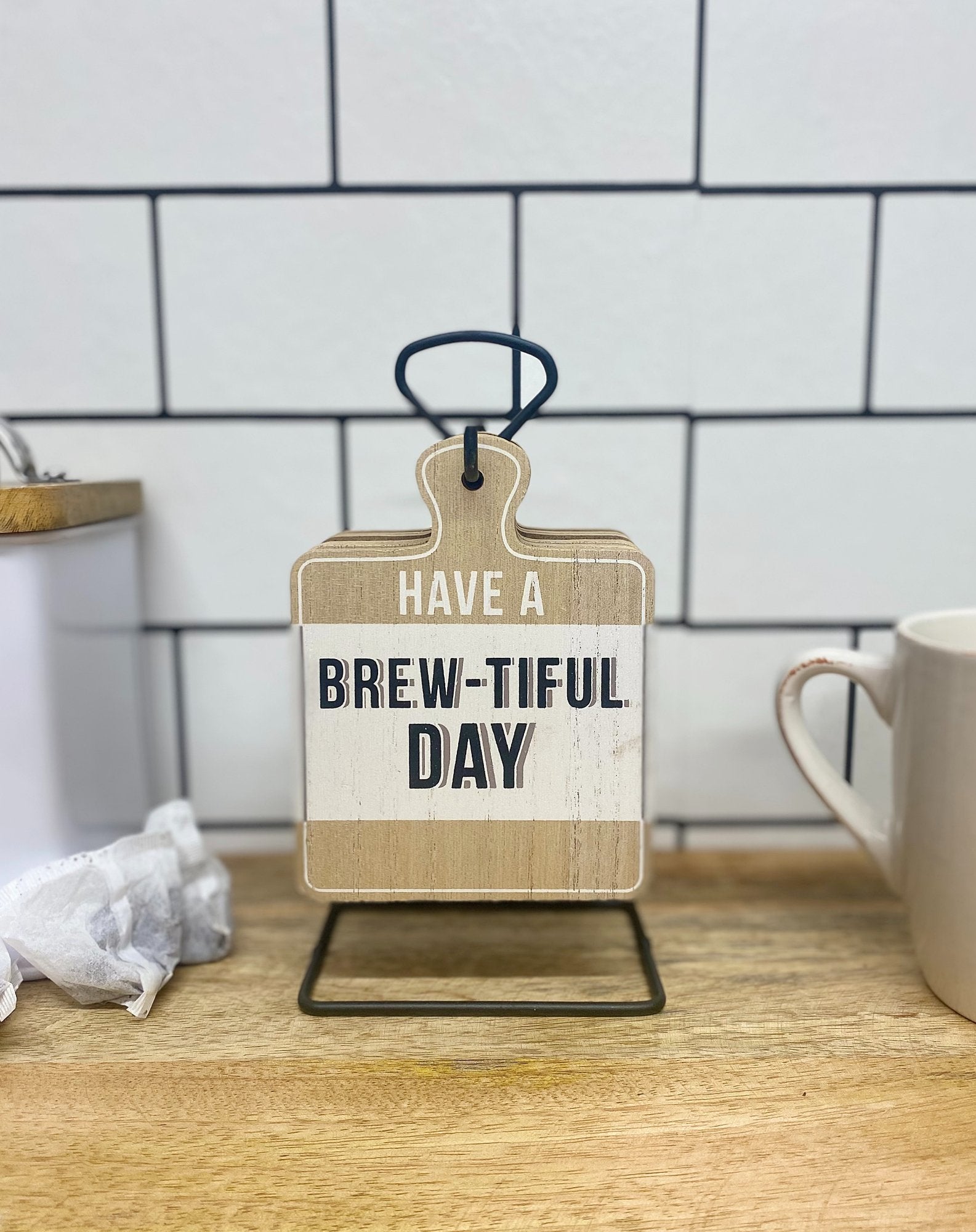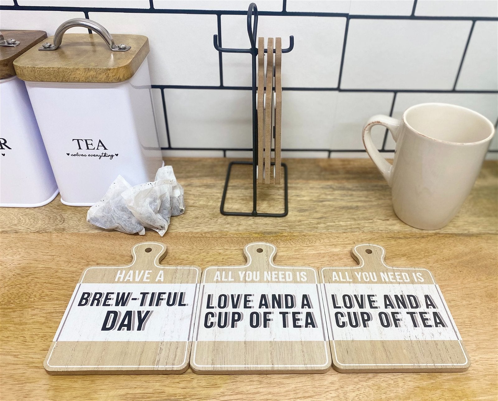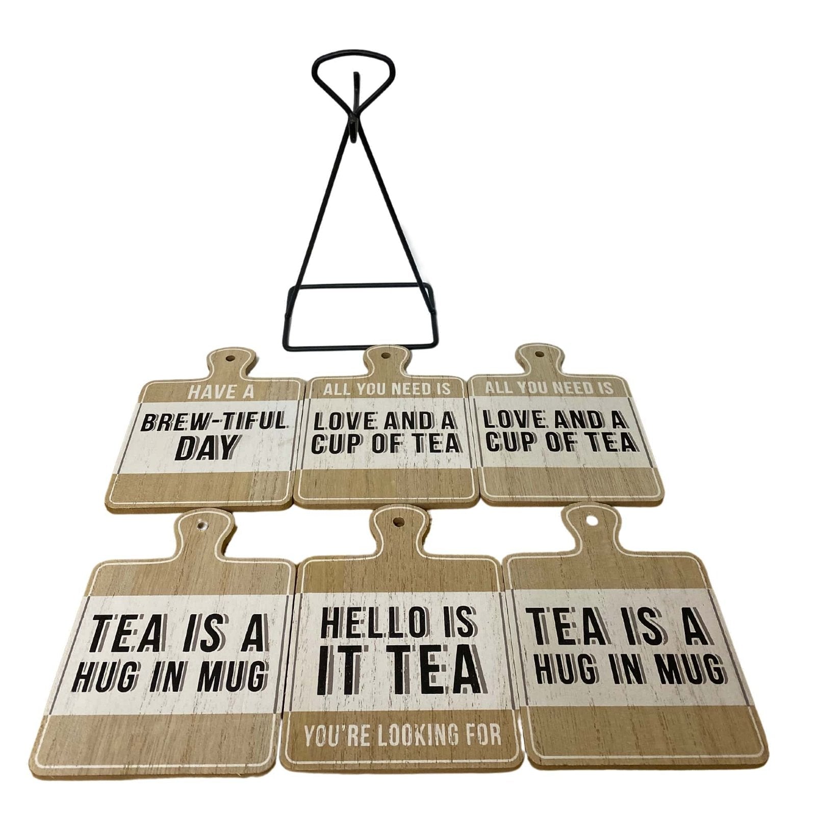 A set of 6 wood effect coasters with a Tea slogan that hang on a handy metal base for storage when not in use. Each coaster measures approximately 10cm x 13cm. The coasters are made of MDF and the slogan is printed in black. Overall measurements are: D7 x H20 x W11cm