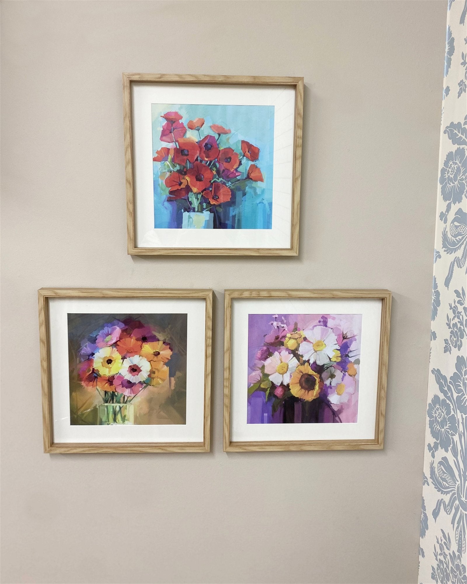 A set of three pretty prints of colourful poppies, large daises and multicoloured pansy's are framed in a simple elegant wooden frame with a cream surround. Each frame measures W31.5cm x D2.5cm x H31.5. A bar wall fixing is fixed. Total set measurements: D31.5 x H7.7 x W31.5cm