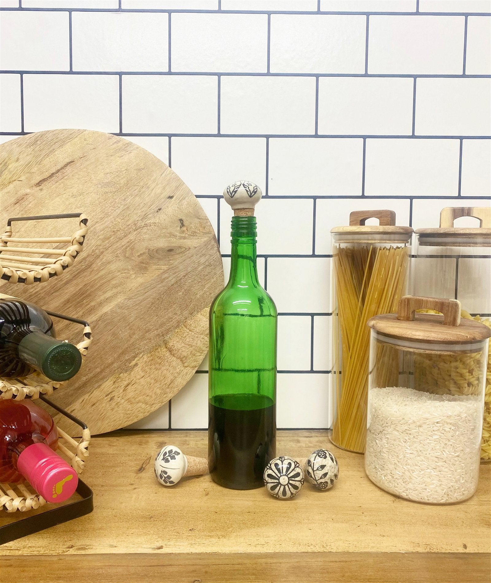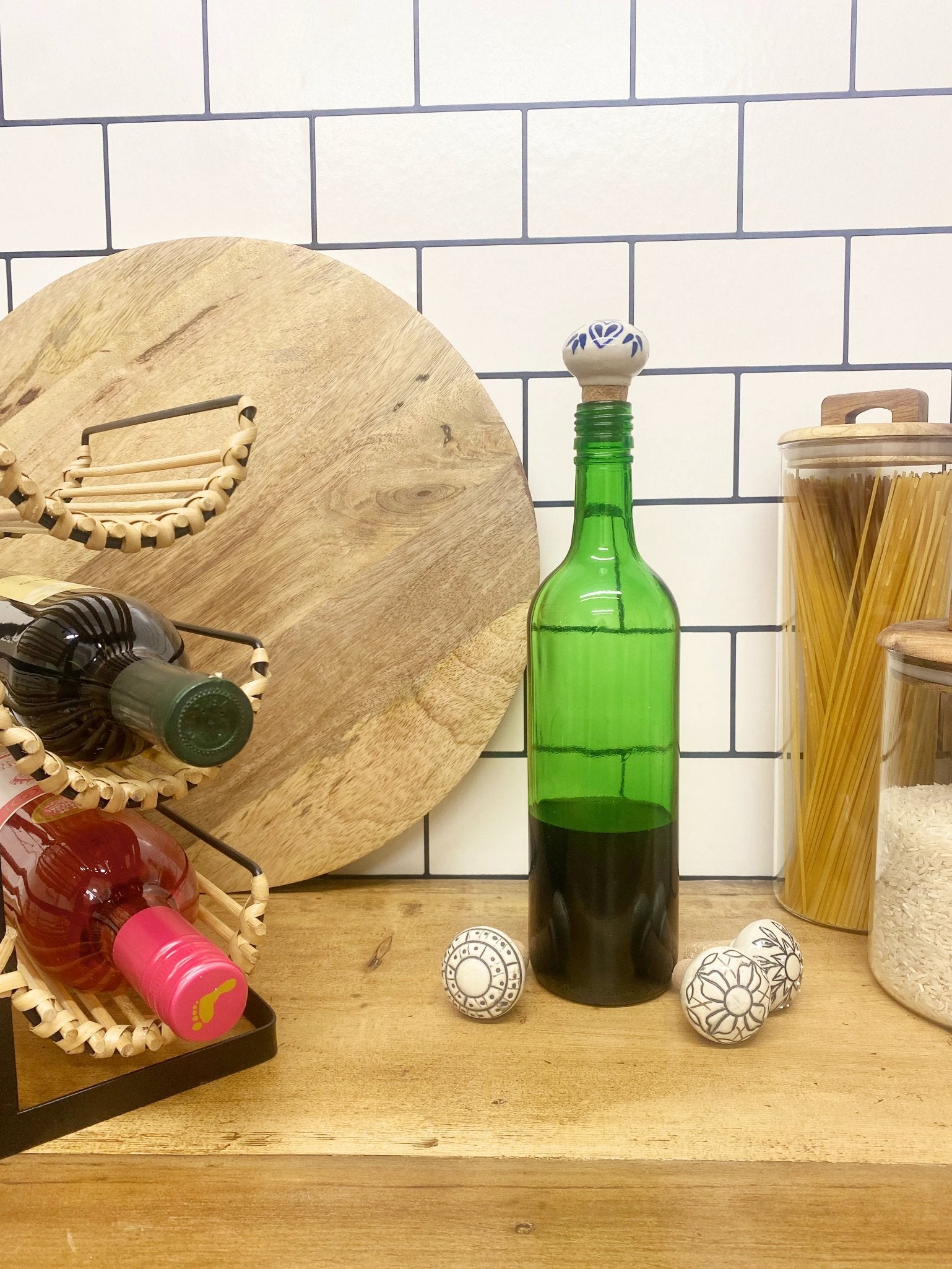 Set of twelve delicately detailed ceramic and cork bottle stoppers. These hand painted bottle stoppers combine function and style. Each bottle stop individually weighs 81 grams. Measurements: D4.5 x H5.5 x W4.5cm