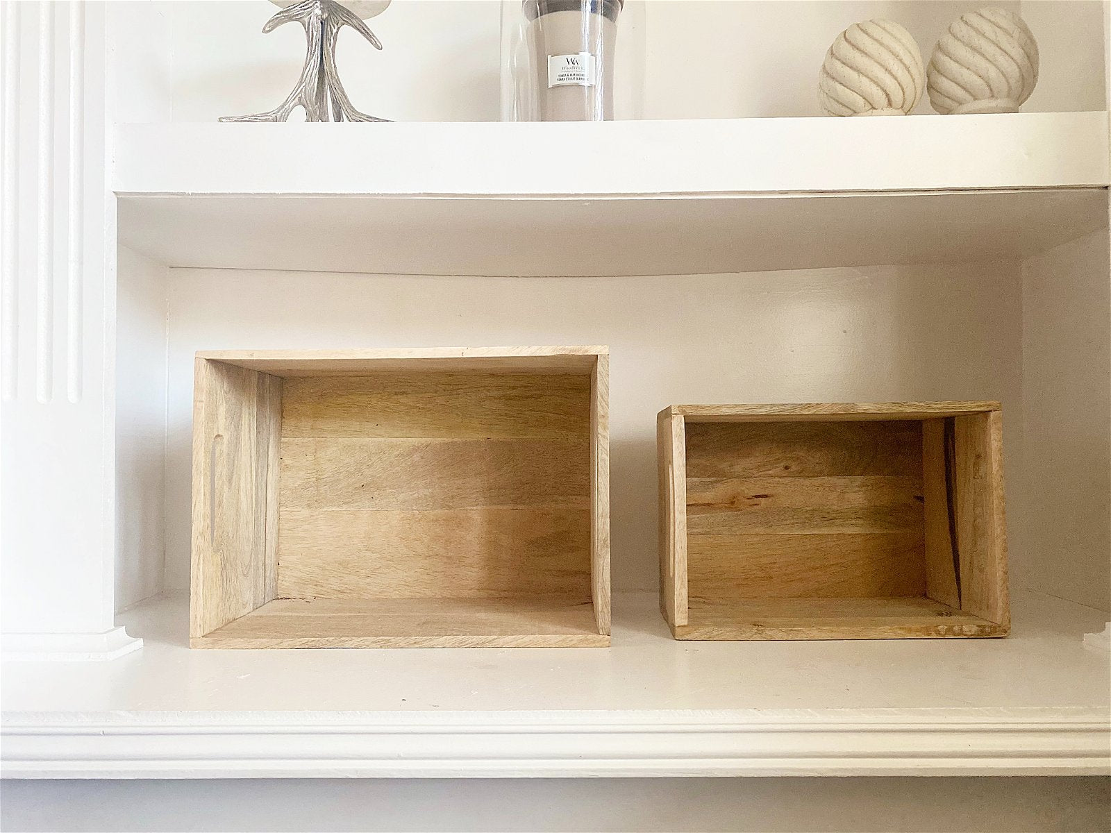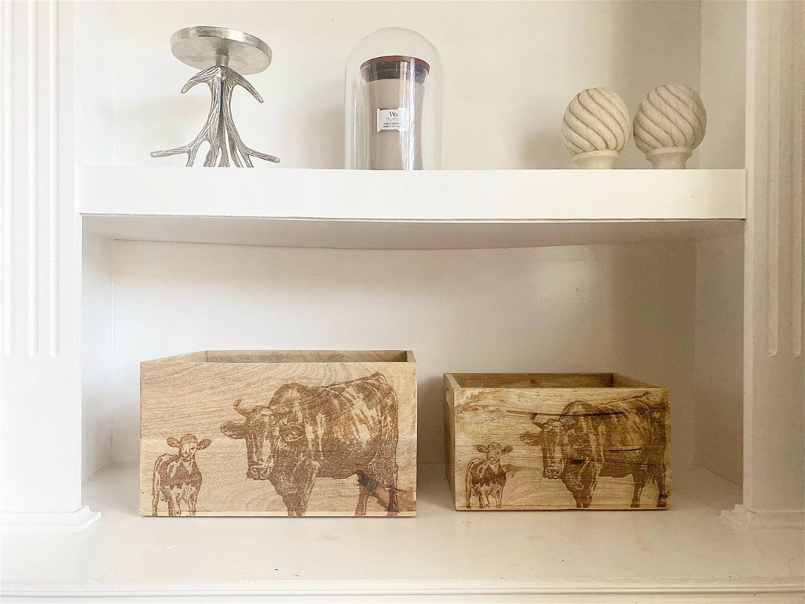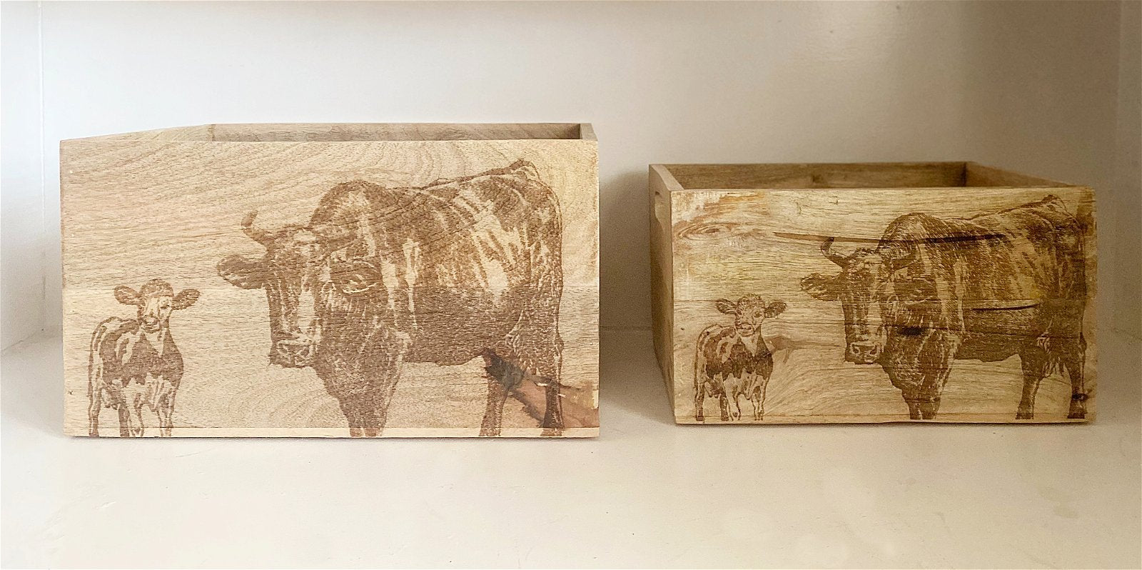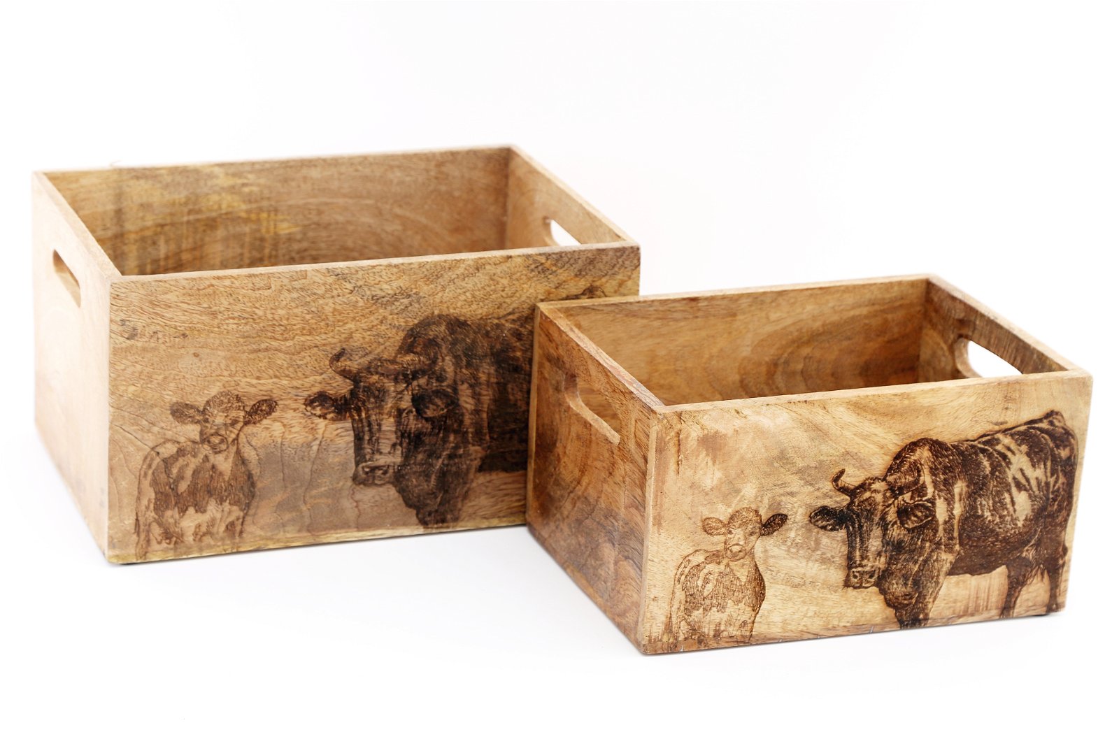 Set of two wooden crates engraved with the portraits of a cow and her calf. A useful pair of storage crates with handles that could be featured throughout a home. The small crate fits inside the larger crate. The smallest crate measuring (W x D x H) 28cm x 20cm x 15.5cm. Measurements: D25.5 x H19 x W35cm