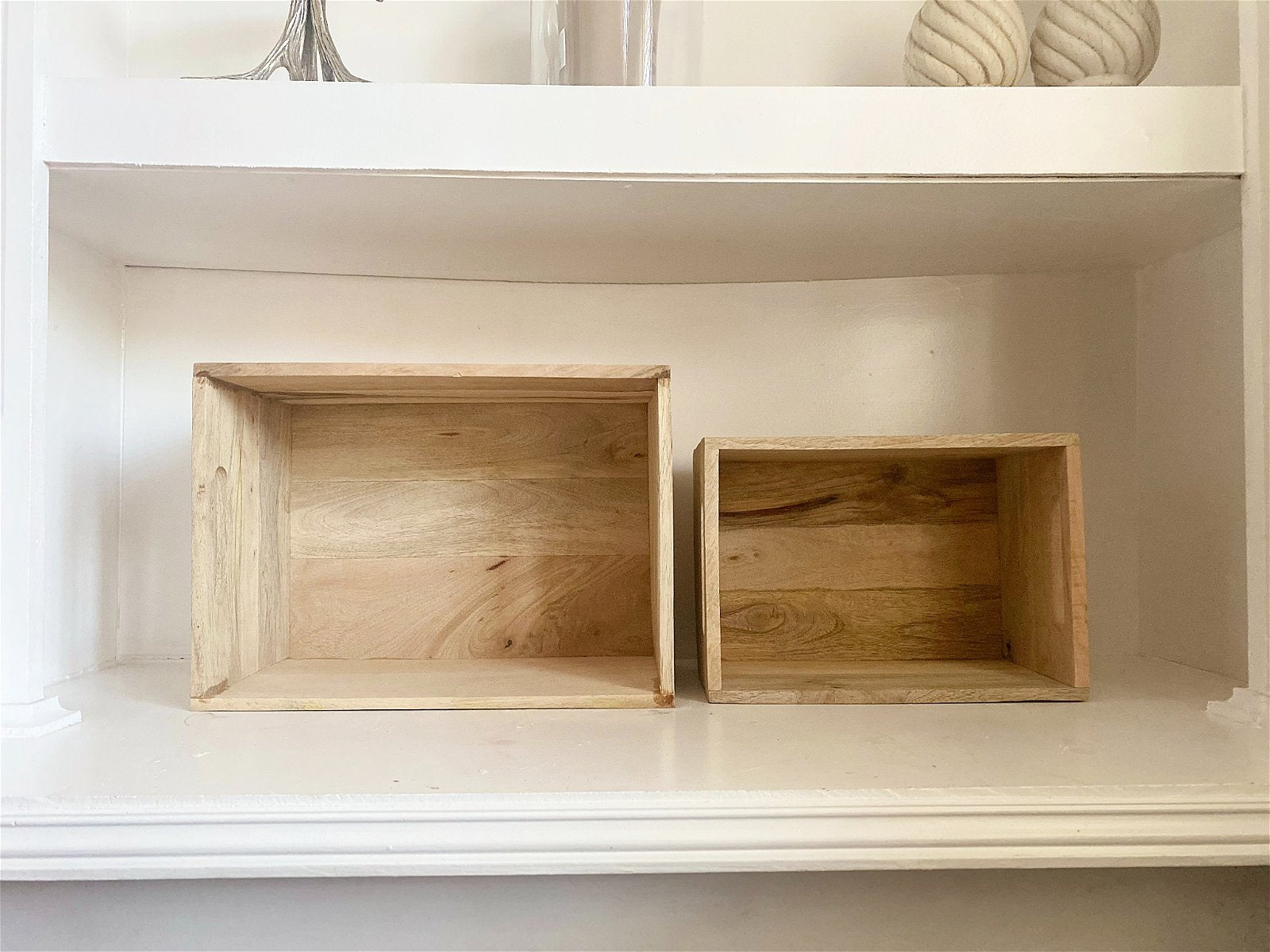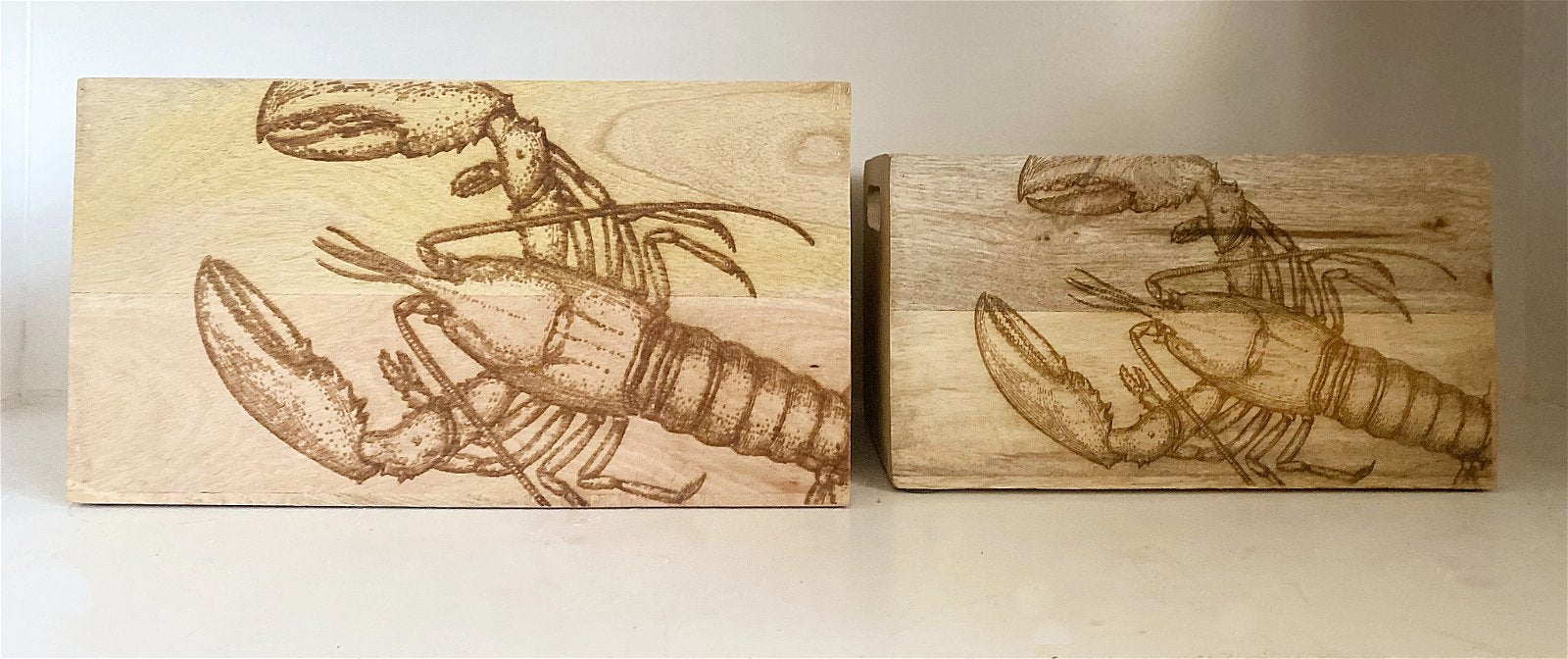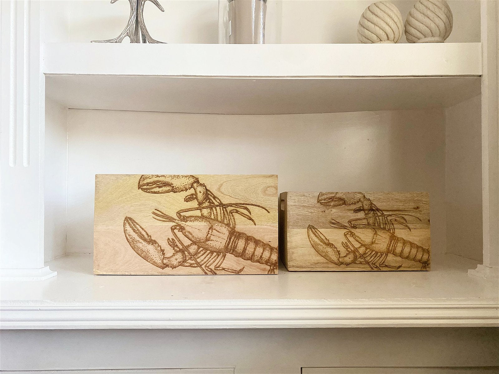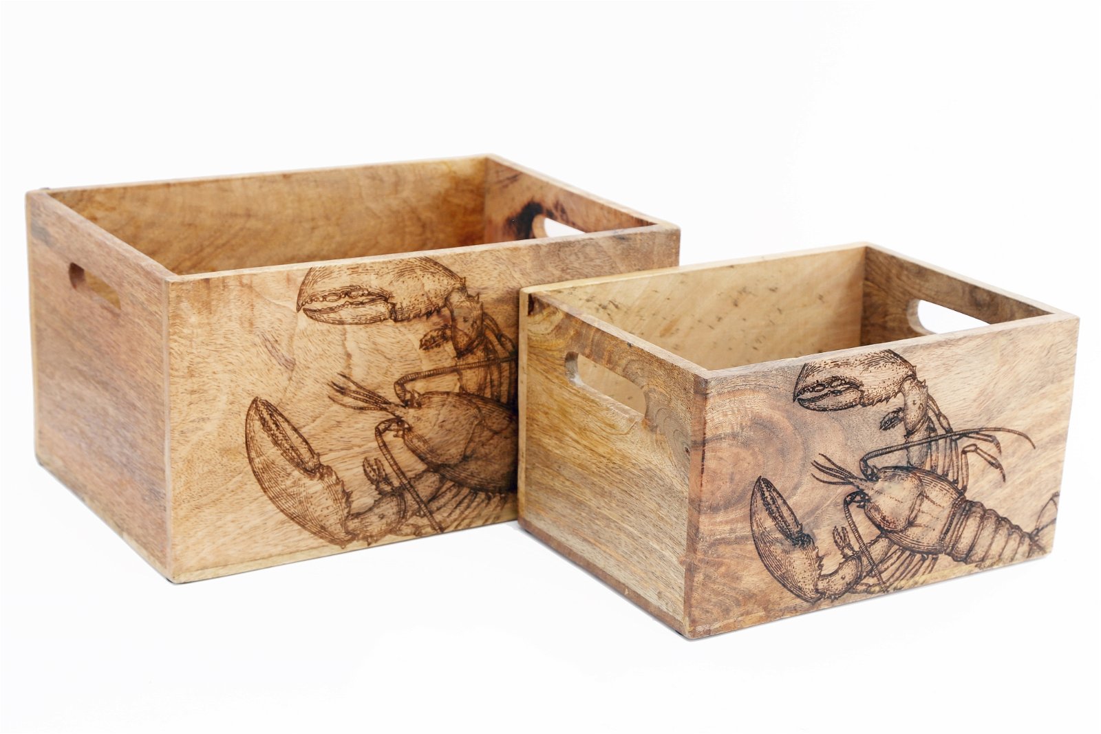 Set of two wooden crates engraved with a portrait of a lobster. A useful pair of storage crates with handles that could be featured throughout a home. The small crate fits inside the larger crate. The smallest crate measuring (W x D x H) 28cm x 20cm x 15.5cm. Measurements: D25.5 x H19 x W35cm