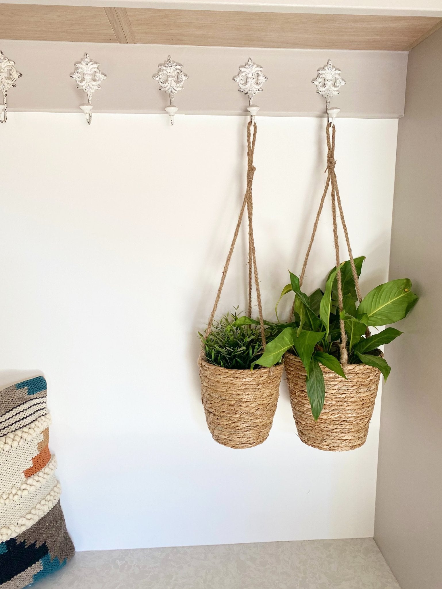 A set of two rush grass hanging planters a decorative accessory that allows you to display plants in a unique and stylish way. The planters are made of natural rush grass fibres that have been woven into a basket-like shape, lined with plastic and attached to a hanging rope. The natural materials used to make the planters give them a rustic and earthy appearance that complements a variety of decor styles, including bohemian, coastal, and farmhouse-inspired interiors. The planters are lightweight and easy to hang, making them ideal for decorating and styling different spaces. The hanging planters can be used to display a variety of plants, from trailing vines to small flowering plants. They can be hung in a window or on a porch to add a touch of greenery and natural texture to the space. Max weight of 3 KG for the larger hanging planter and 2 KG for the small hanging planter. Measurements: D22 x H23 x W22cm