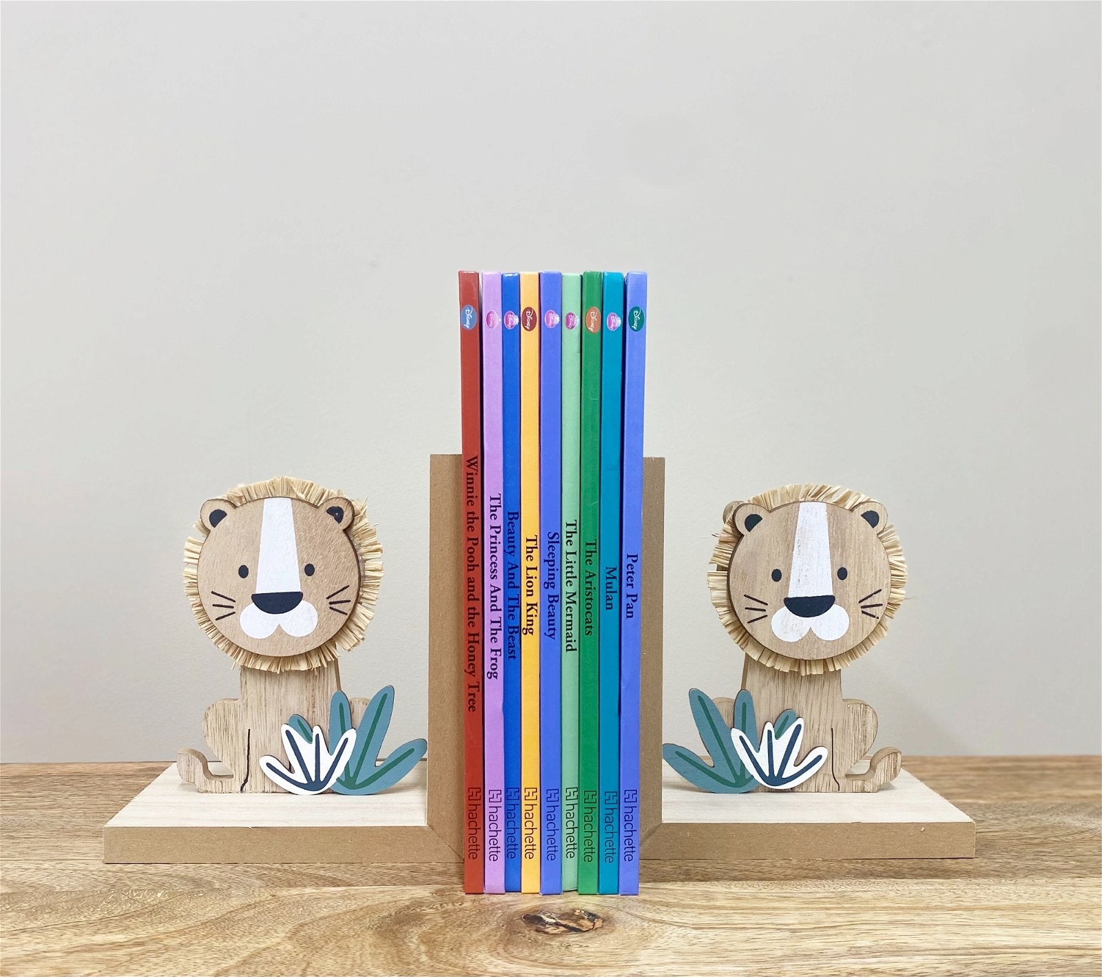 A set of two wooden bookends each with a cartoon style lion figure sat among grass effect. Each wooden bookend has a base of 15x10cm and 17cm high including a lion figure. The lions are natural wood with black and white detail plus raffia mane, each 15cm height & 9cm wide. These cute bookends would be a useful and charming addition to any child's bedroom or nursery. Measurements: D10 x H17 x W30cm SKU: BB0378