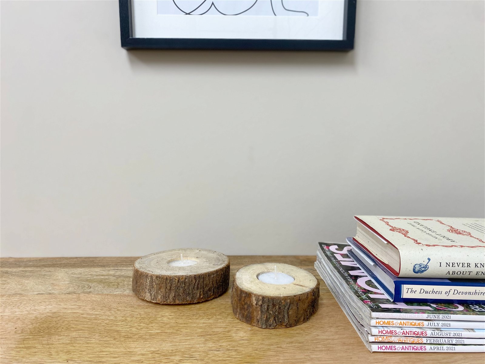 A set of 2 tea light holders (plus tealights) made of Camphor wooden with bark detail. The larger holder has diameter approx 12cm and depth 3cm, the small holder diameter approx 10cm and depth 3cm. Overall measurements: D11 x H6 x W12cm