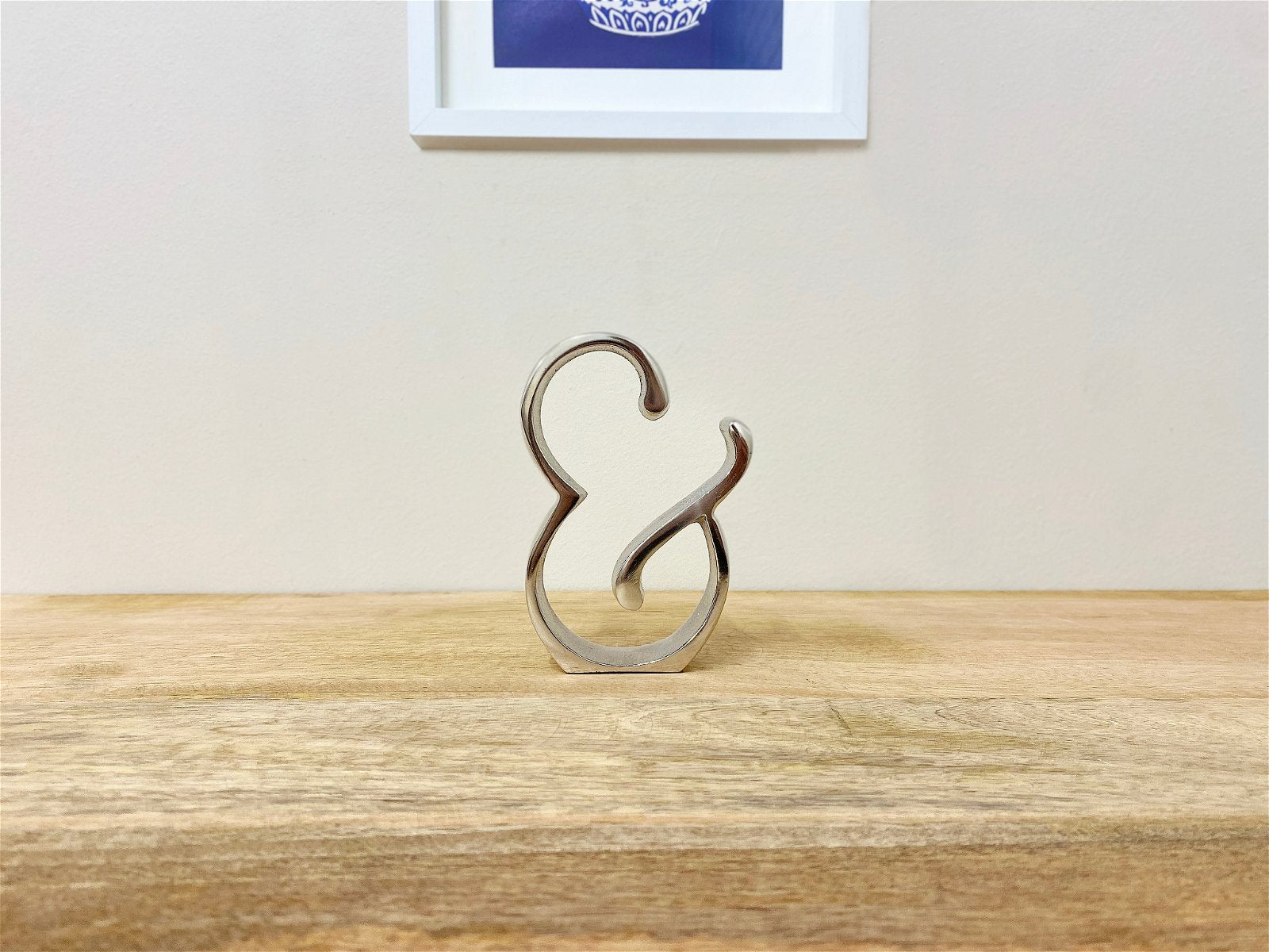A freestanding Ampersand or AND sign ornament in silver metal perfect for a shelf, window sill or mantelpiece. This item has a highly polished aluminium exterior and has a flat base with a felt covering to protect any home surfaces. Measurements: D11 x H2 x W7.5cm