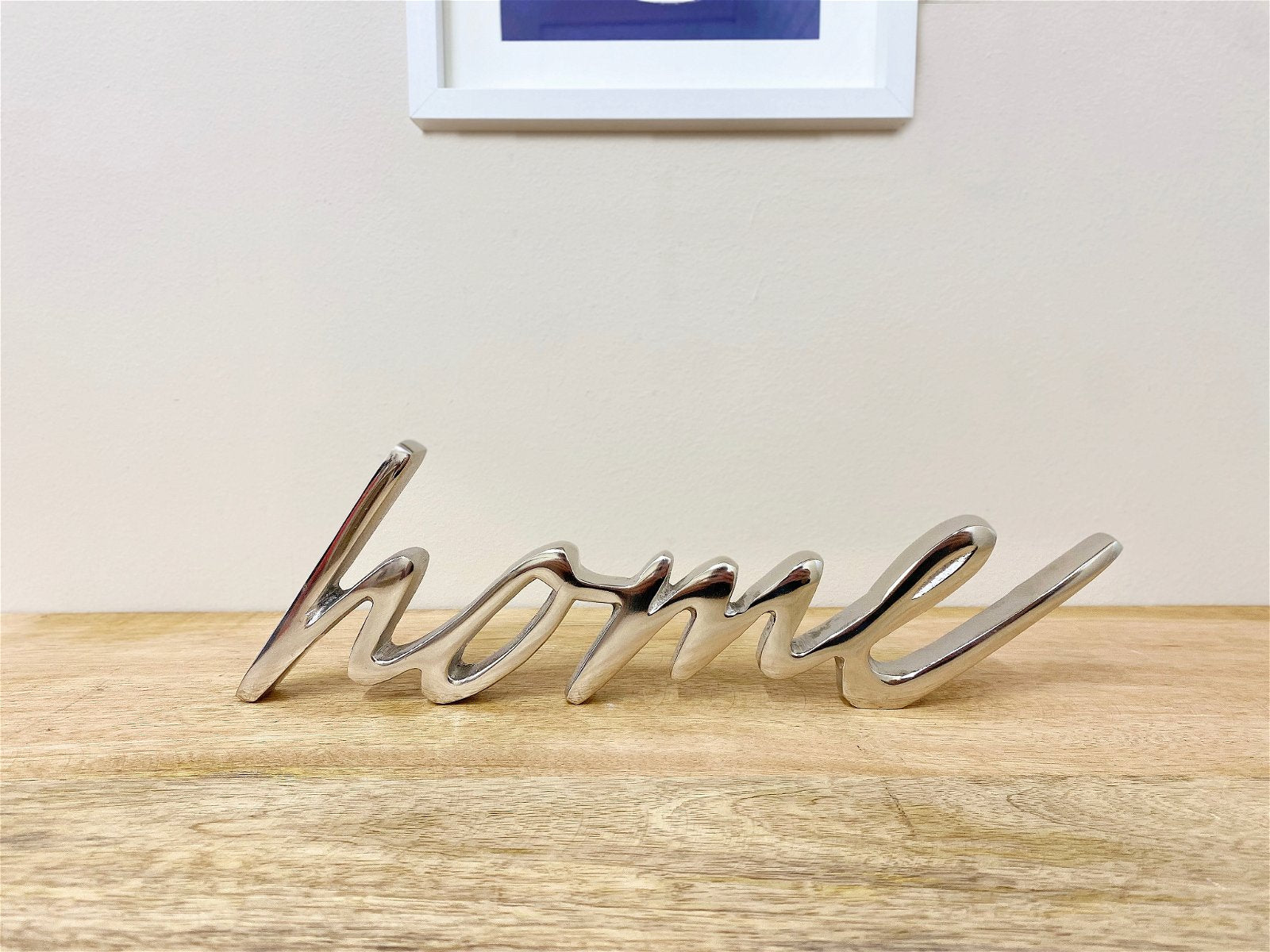 A freestanding HOME ornament in silver metal perfect for a shelf, window sill or mantelpiece. This item has a highly polished aluminium exterior and is crafted with a cursive font. Measurements: D8.5 x H2 x W28.5cm