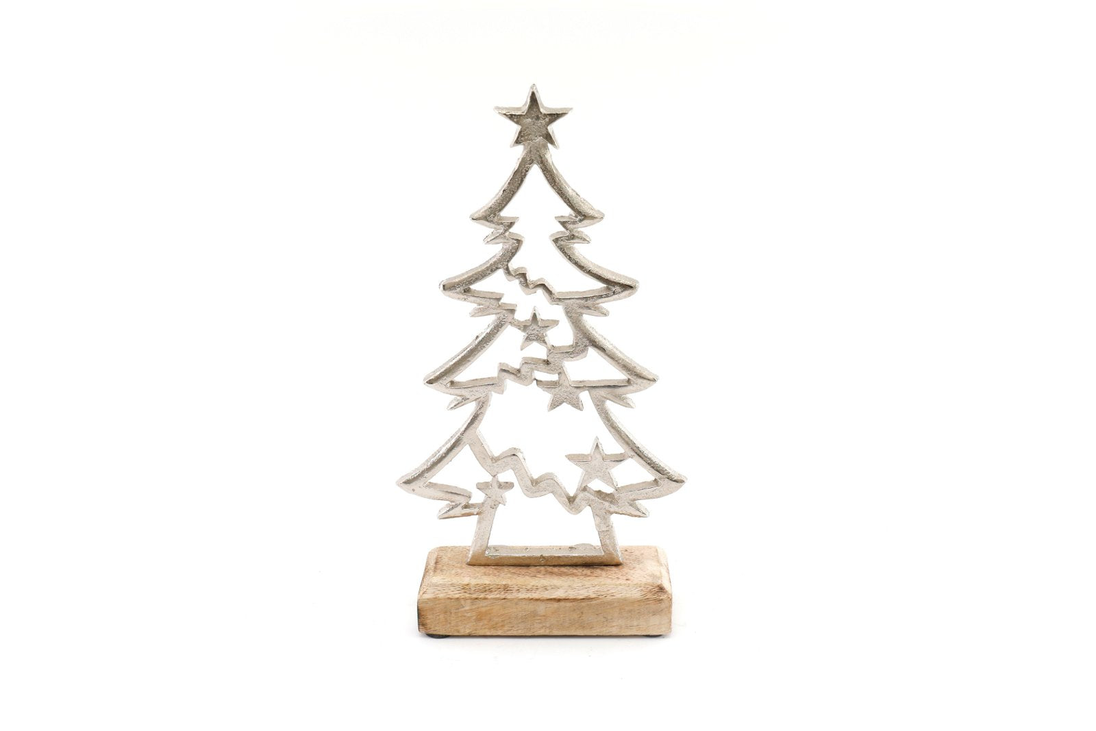 A contemporary design of a silver Christmas tree shape, fixed upon a wooden plinth. A striking decoration to enhance your Christmas displays. Measurements: D5 x H16 x W26cm