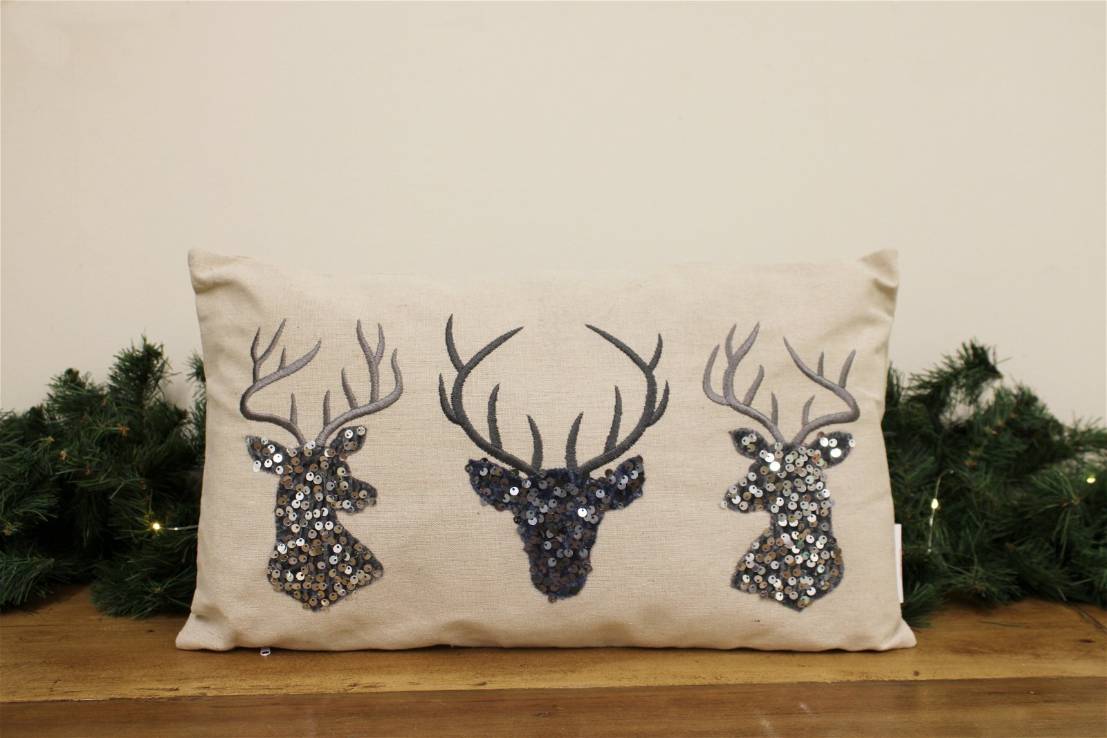 Sequin embellished rectangle reindeer scatter cushion. In a grey and silver colourway. Features a full length zip, cushion insert included. Perfect gift idea. Measurements: D12 x H27 x W47cm