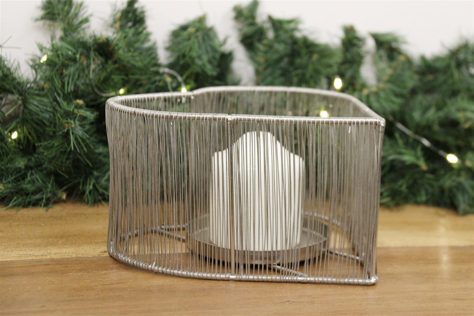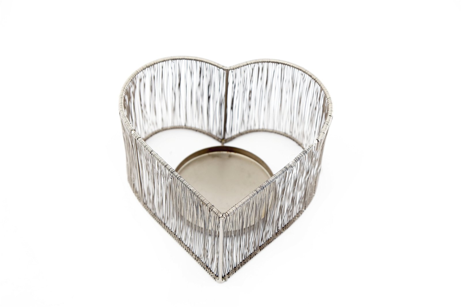Heart shaped silver tealight holder. Made from 100% Iron. Measurements: D11 x H20 x W20cm