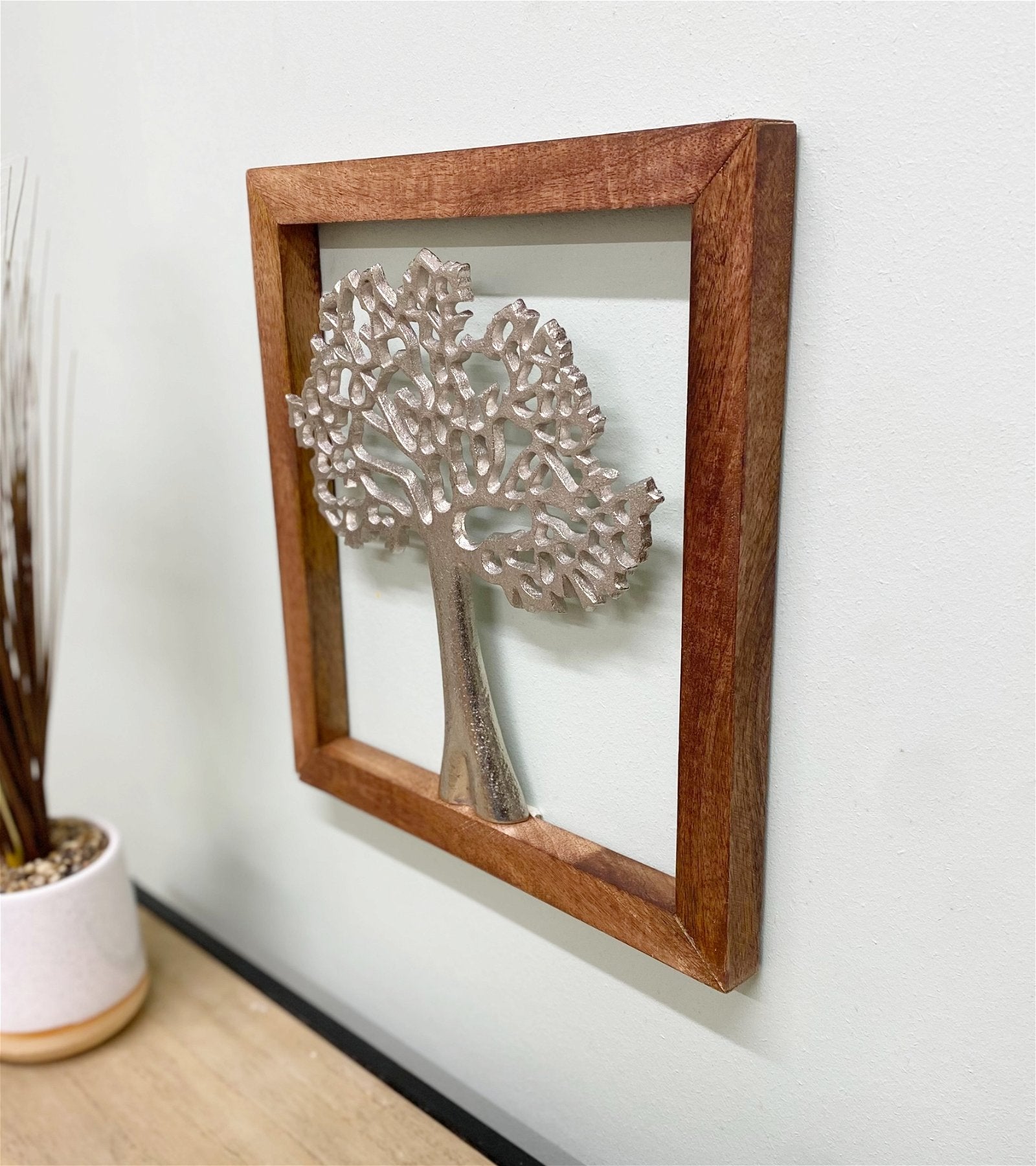 A natural wood frame with a silver tree of life silhouette. The natural wood frame embraces the delicately sculpted silhouette of a tree of life in silver metal. A bewitching piece of simplicity and design. Overall measurements: D2 x H31 x W29cm