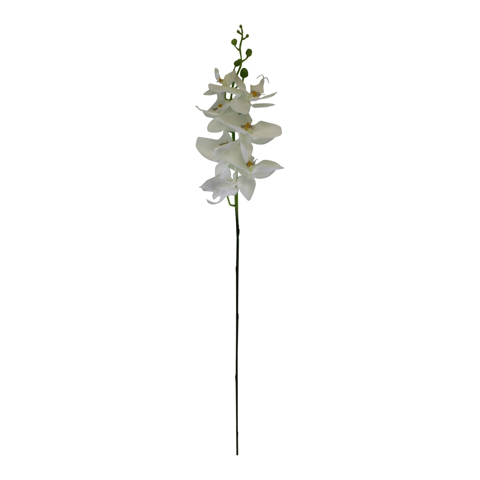 A single spray of faux orchid with white flowers. The spray is made of polyester leaves and flowers and a plastic stem. The leaves contain wire which can be manipulated to position the leaves as required. Measurements: 10 x 85 x 16cm SKU: FL1024