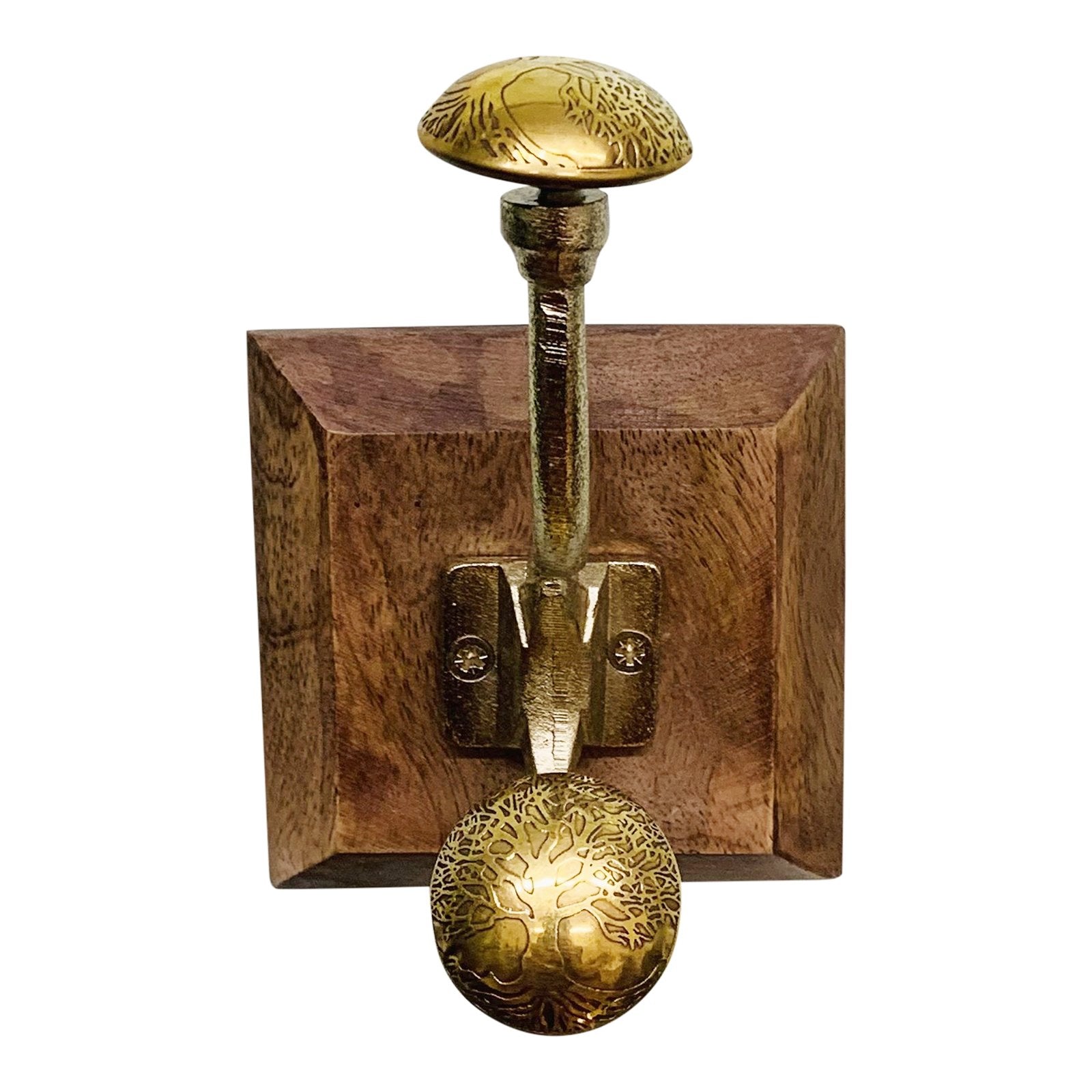 This intricately designed singular hook would be a lovely accessory to any home. The dark wooden wall mount contrasts nicely with the brass hooks, allowing the tree of life design to stand out. The wooden base measures 10.5x10.5x2cm. The tree of life design on brass effect knobs have a diameter of 4cm. Overall measurements are: D12 x H18 x W11cm SKU: TL0097