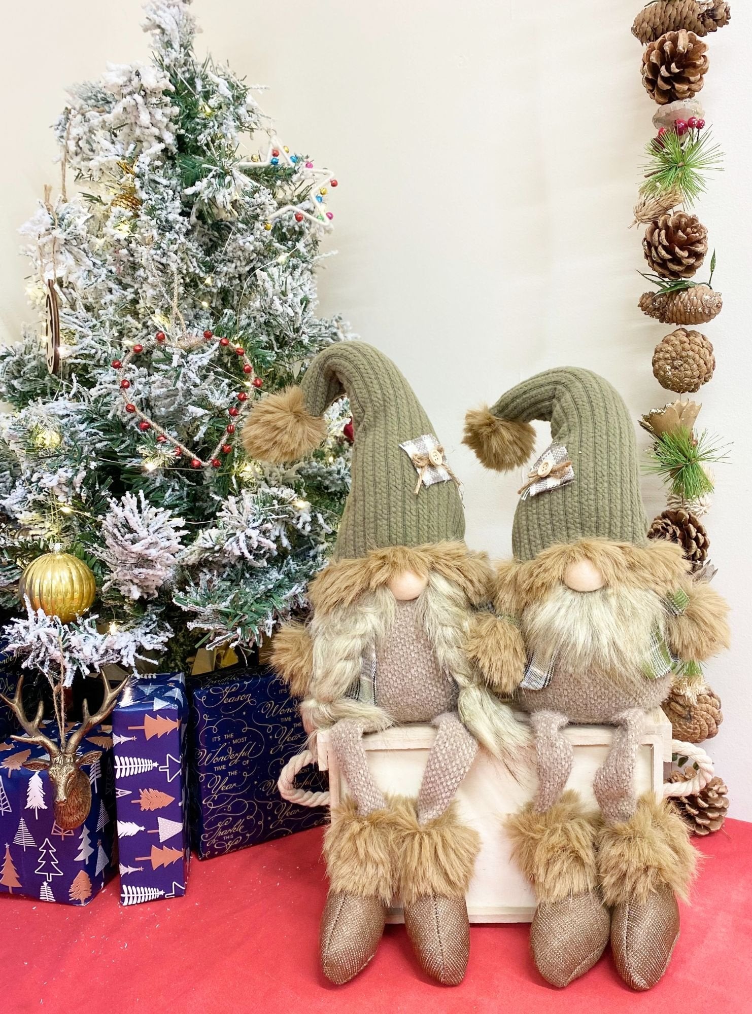 Two green and brown gonk depicting Mr and Mrs. They both have green knitted conical hats with brown fur bobbles, brown tufty hair peeking out under the hat and also on the hands and above their boots. The body and dangly legs are soft pale brown material and they are wearing complimentary green checked waistcoats. Mr gonk has a natural coloured beard and Mrs gonk has two natural coloured long plaits. A comical pair who will add great cheer and amusement to every home over the Christmas period. The height of them sitting is 30cm with a width of 21cm. Their legs including boots are 22cm long. The hats are strengthened by a wire frame. Overall measurements are: D13 x H65 x W37cm