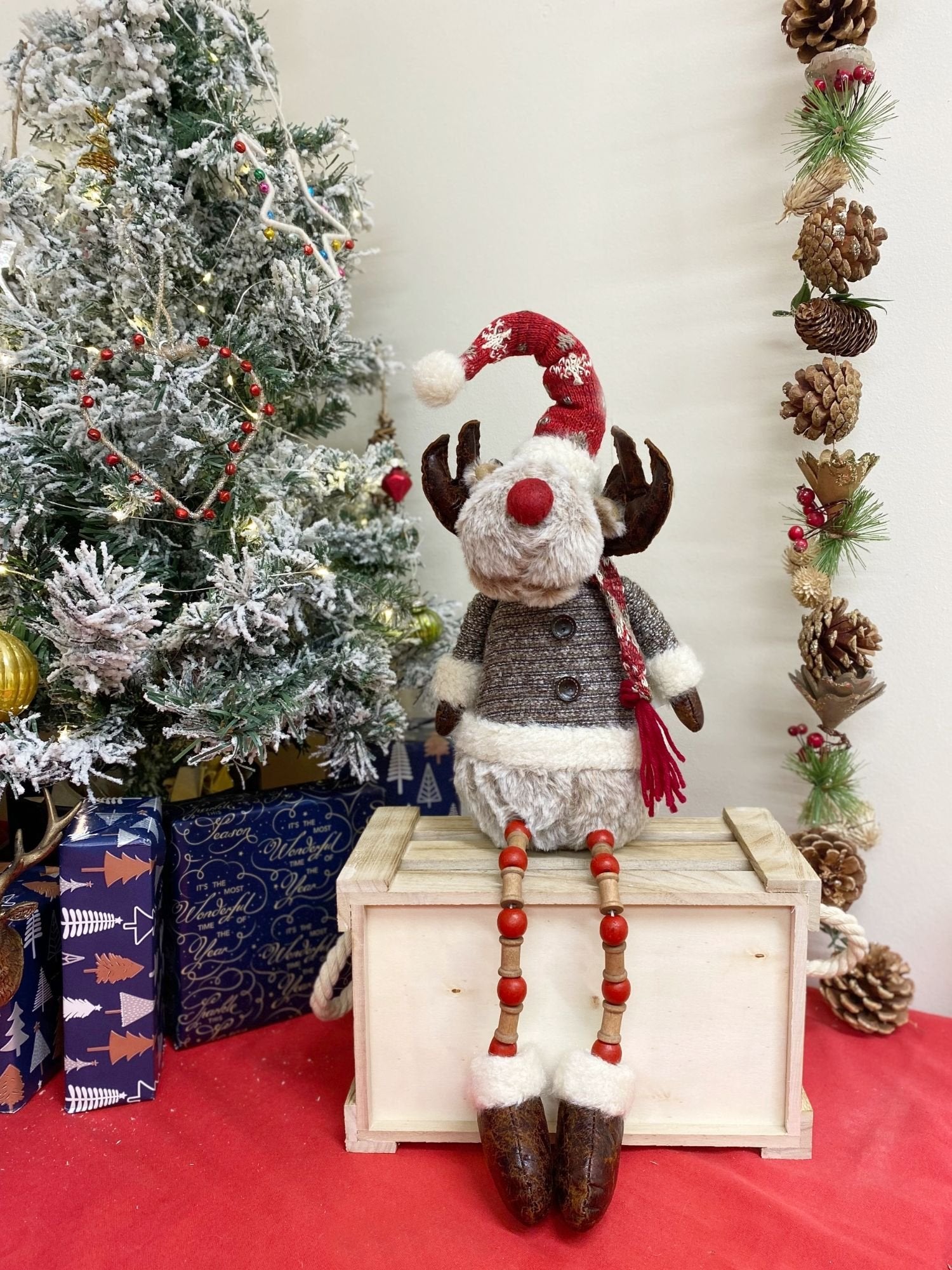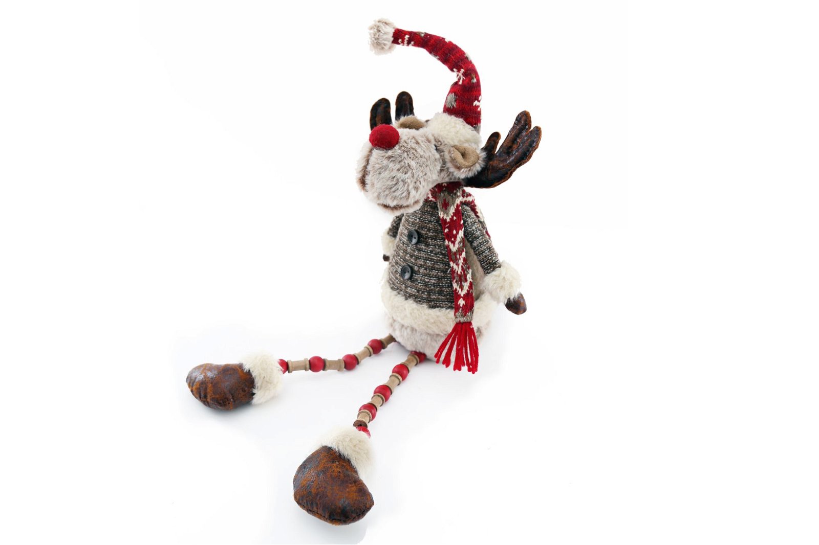 This charming addition to the Christmas collection is attractive and comical. He is a soft furry reindeer dressed in a knitted bobble hat, scarf and brown coat, with hands, feet and antlers made from sewn faux leather. His dangly legs are threaded beads and reels making them multi jointed adding to comedic appeal. The body dimensions are 32cm x 18 cm x 14cm, the legs and feet are 22 cm long. Overall measurements are: D13 x H46 x W20cm