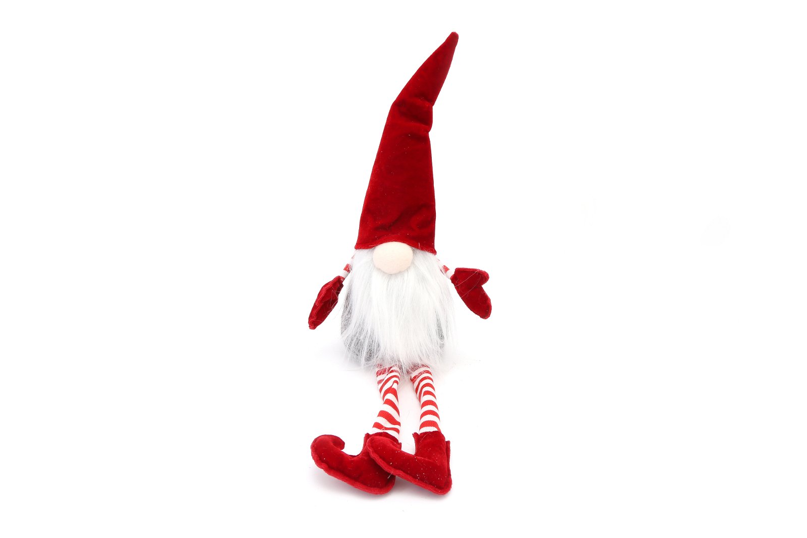 A red fabric Gonk with hanging legs perfect for hanging over the hearth. Festive character to decorate any home at Christmas time. Leg length measures 20cm and the hat measures 22cm. Measurements including legs: D9 x H54 x W15cm