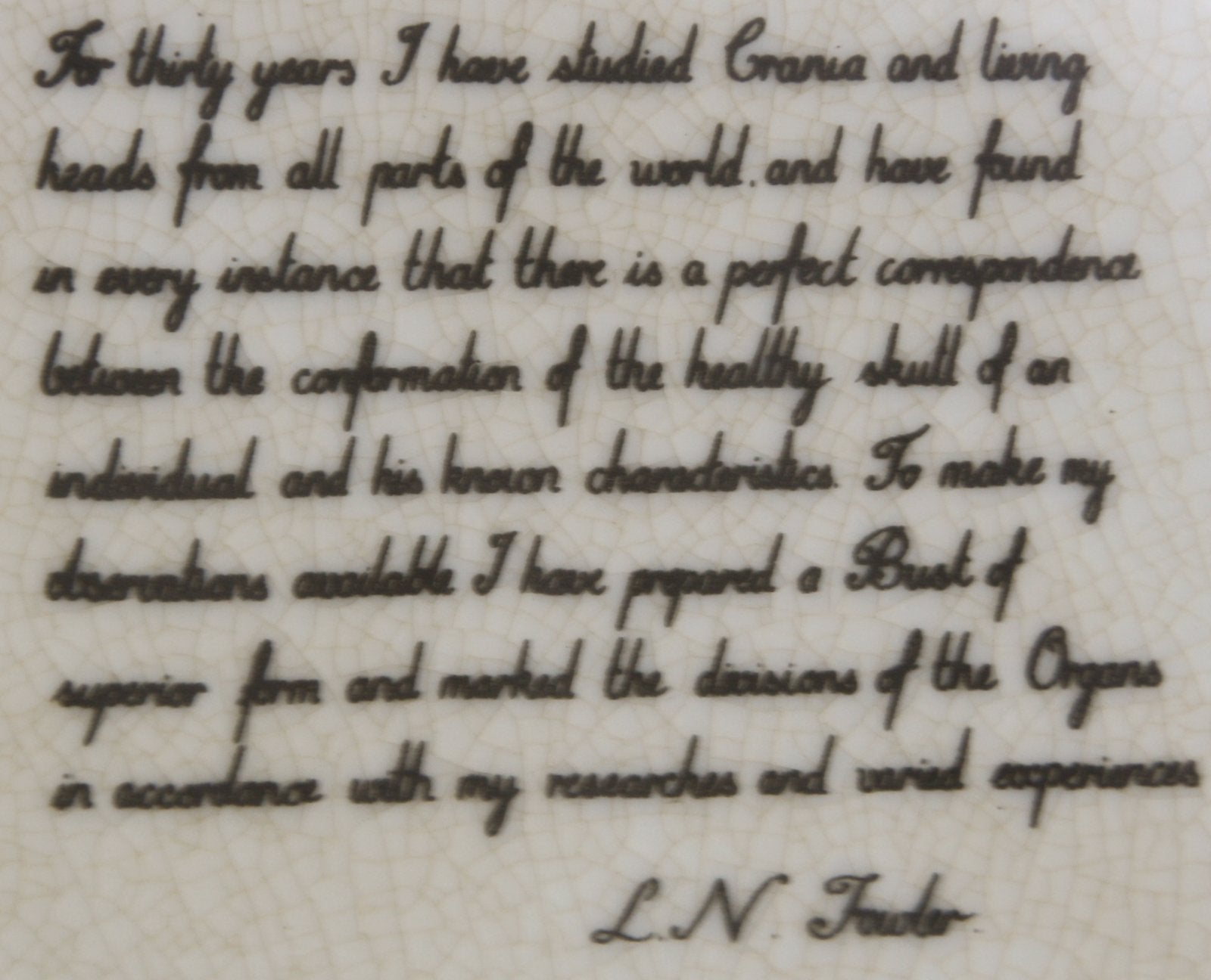 Phrenology is from Ancient Greek meaning 'knowledge'. It is a pseudoscience which involves measuring bumps on the skull to predict mental traits. This ceramic phrenology head stands 19cm tall and features a quote from Mr L N Fowler, the founder of the art along with the sections of the head and their characteristics. Made of ceramic, off white in colour with a crackled finish and black lettering. Measurements: 11 x 19 x 9cm